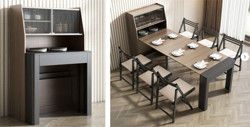 This slender hutch expands into a table with enough space to comfortably seat 6 people. It's a great option for times when extra company requires additional dining space, or for smaller areas that don't need a big table most of the time.