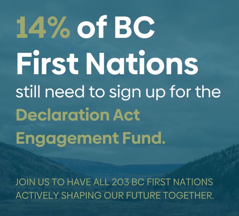 The Declaration Act Engagement Fund (DAEF) provides multi-year (4 year) non-repayable funding contributions to First Nations to support their capacity to engage with the Province of B.C. on the implementation of the Declaration Act Action Plan and alignment of Provincial laws with the United Nations Declaration on the Rights of Indigenous Peoples both of which must be done in consultation and co-operation with Indigenous Peoples in B.C. |