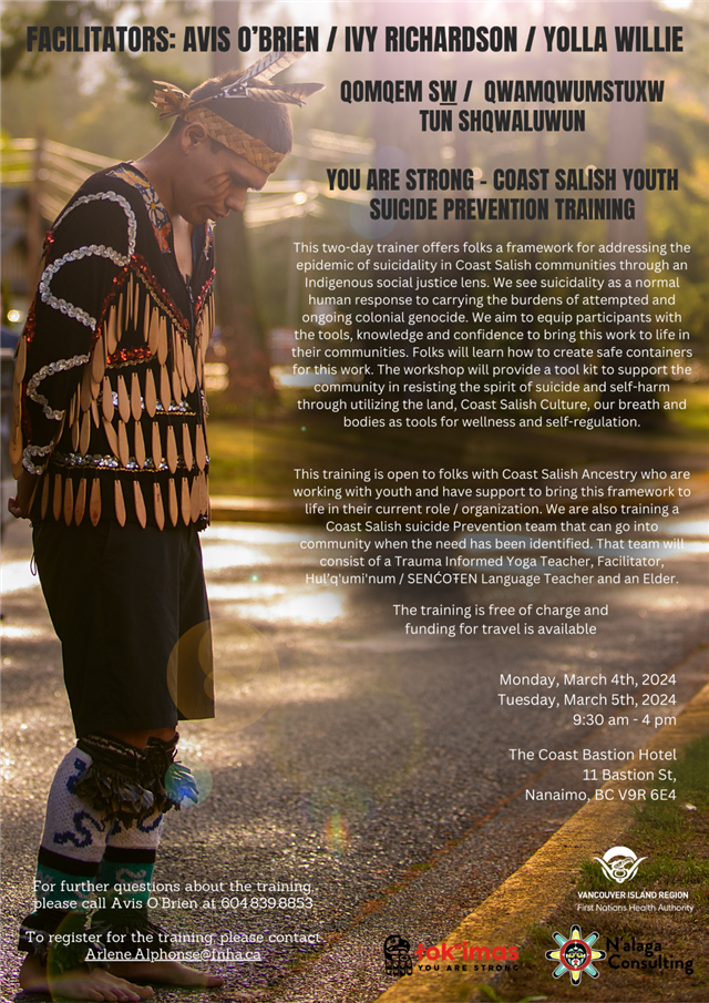 This two-day training program provides a comprehensive framework for addressing suicidality in Coast Salish communities through an Indigenous social justice lens. Participants will gain tools, knowledge, and confidence to implement this approach, creating safe spaces for the community. Open to individuals with Coast Salish Ancestry working with youth, the training also forms a Coast Salish Suicide Prevention team, comprising a Trauma-Informed Yoga Teacher, Facilitator, Hul’q'umi'num/SENĆOŦEN Language Teacher, and an Elder.