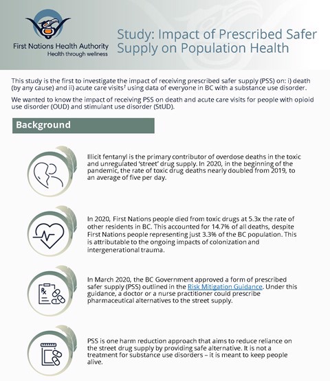 FNHA's toxic drug crisis response research webpage is a repository of collaborative publications created by health system partners related to the toxic drug public health emergency. Evaluations are conducted by FNHA in partnership with researchers from the Centre for Advancing Health Outcomes, Simon Fraser University, Canadian Institute of Substance Use Research at the University of Victoria, BC Centre for Disease Control, among others.