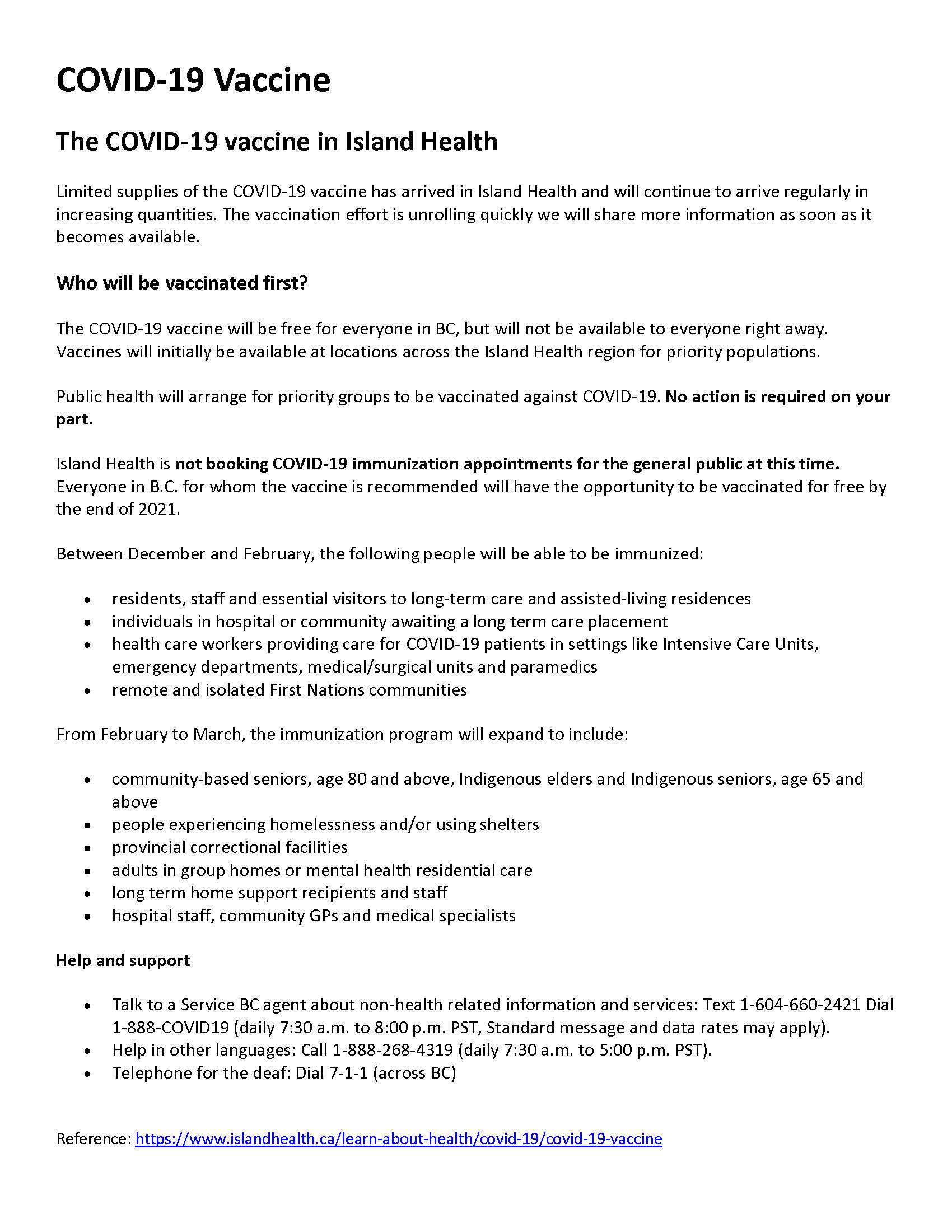 Vancouver Island Regional team and Island Health invite all Vancouver Island Governance and Health leadership to a town hall meeting for a discussion on the COVID-19 pandemic and vaccine roll out. Participants are encouraged to submit any questions you may have regarding the vaccine to - vi.engage@fnha.ca. |