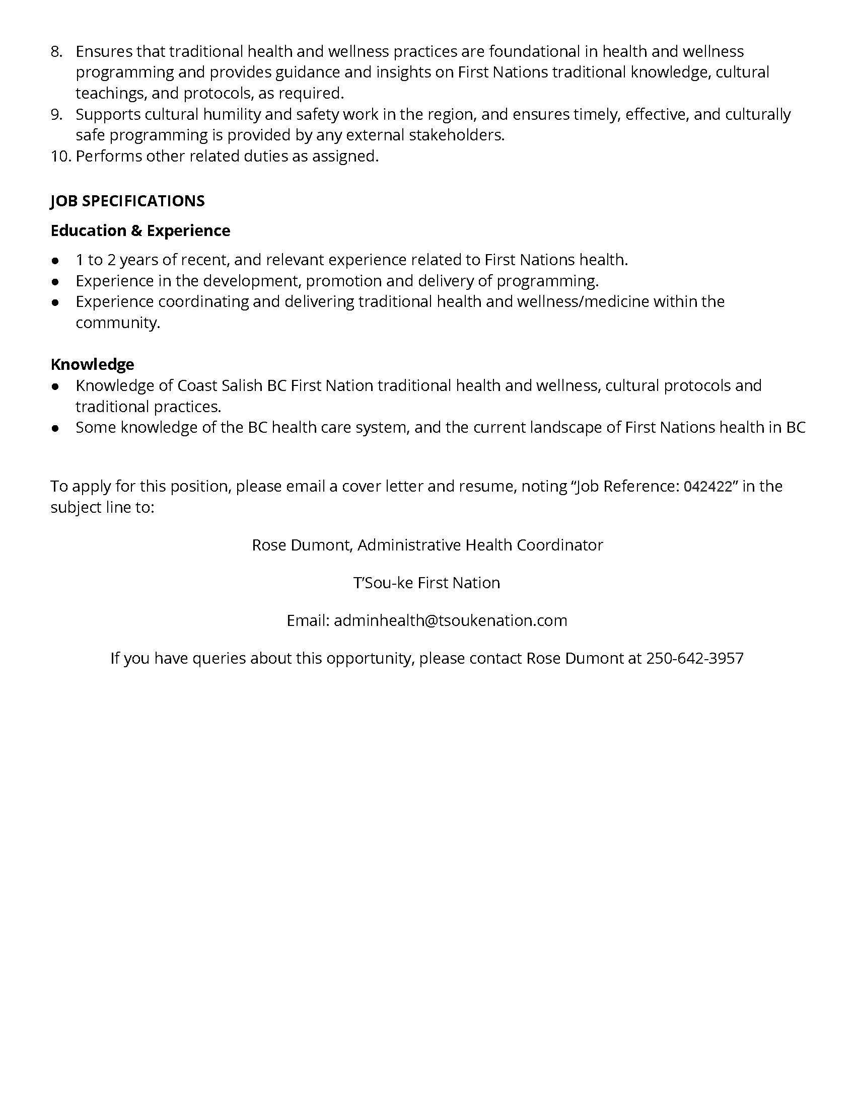 Health and Wellness Coordinator, T’Sou-ke First Nation