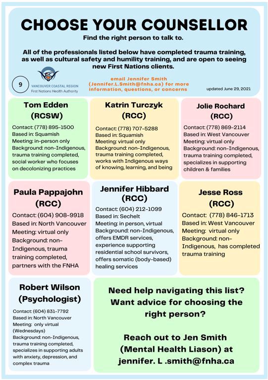 Please see FNHA’s Health Benefits Guide on how to “Accessing Mental Health Benefits” – link and screenshot below