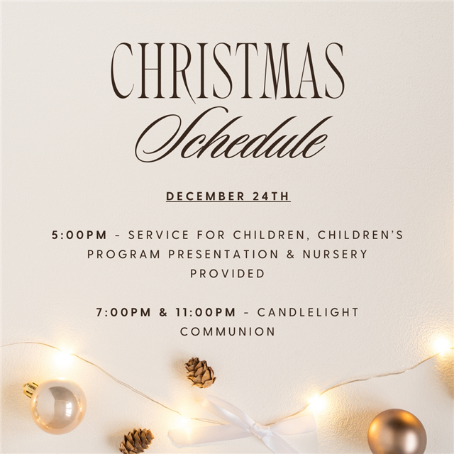 Please take note of the Christmas Eve services below. The 5pm service will include an encore presentation of the children's program "A Very Special Night." The 7pm and 11pm candlelight services will include communion.