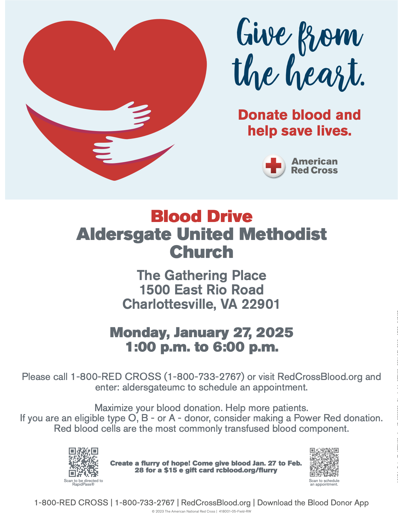 Please call 1-800-REDCROSS or visit RedCrossBlood.org and enter 'aldersgateumc' to schedule an appointment.