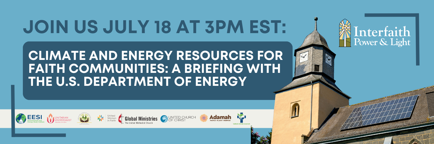 The Inflation Reduction Act (IRA) and Infrastructure Investment and Jobs Act (IIJA) have provided resources for energy and climate resiliency improvements that can be used in houses of worship and our homes, included clean energy tax credits for wind and solar, EVs, efficiency upgrades, heat pumps, and much more. They have also made it easier for nonprofits and houses of worship to access clean energy funds and tax credits through a program called “direct pay.” Join Interfaith Power and Light on July 18th at 3 pm ET/Noon PT for a briefing with the U.S. Department of Energy on the climate and energy resources for faith communities.