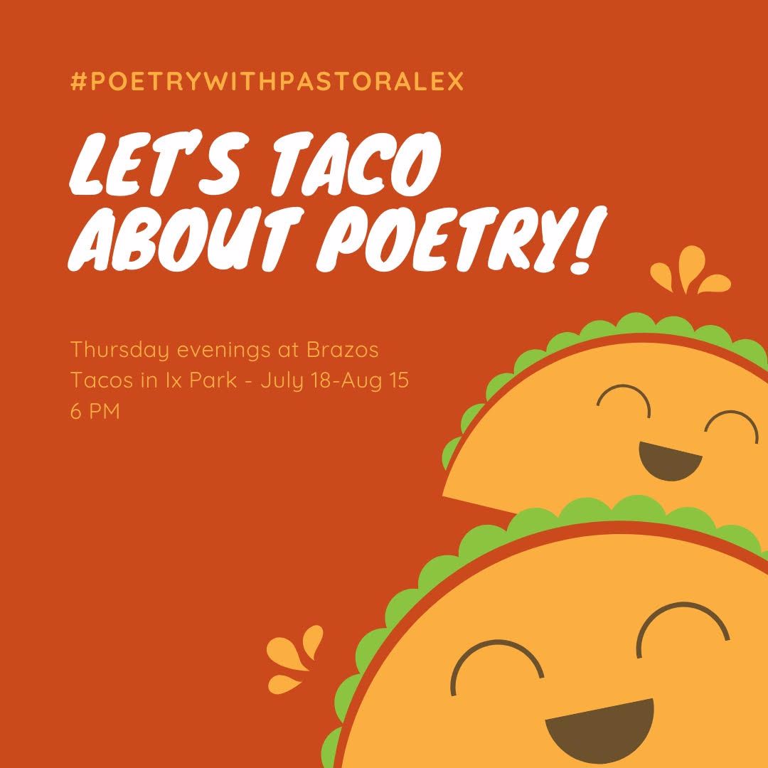 Do you love tacos and poetry? Join Pastor Alex beginning July 18th at Brazos Tacos at IX Park to enjoy both.