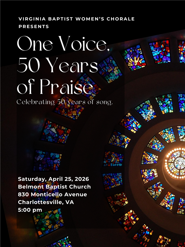 Join the Virginia Baptist Women's Chorale in celebration of 50 years of Praise. The concert will be held at Belmont Baptist Church at 830 Monticello Avenue. The mother of Jon Buckner, a member of our AV Staff, was a founding member of this group.