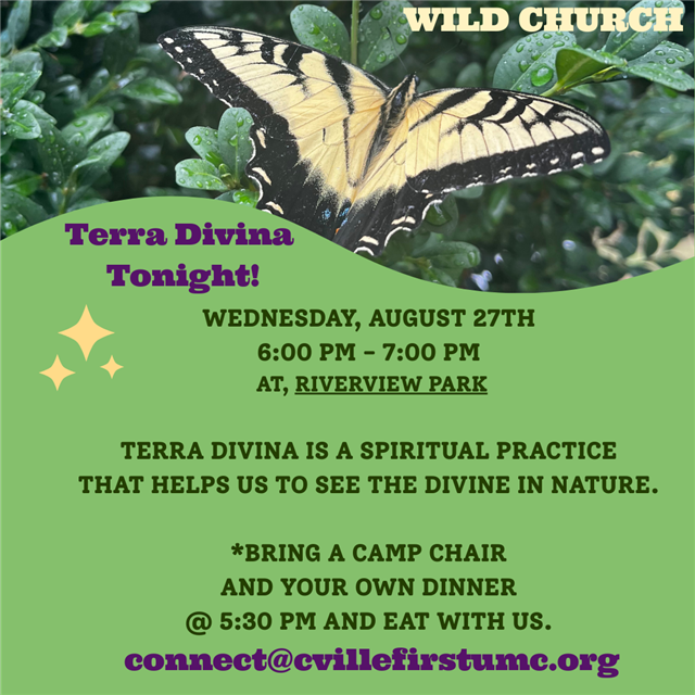 Terra Divina is a spiritual practice that helps us see the Divine in nature. Join us at Riverview Park this evening. Bring a chair!