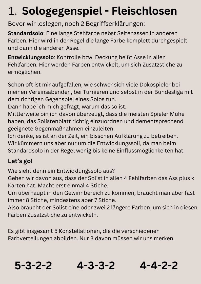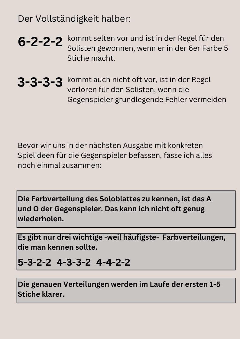 ich freue mich sehr, dass die magischen "100" meiner Newsletterabonnenten geknackt wurde und werde mich auch weiter bemühen, Euch mit vielen Praxisbeispielen zu versorgen. In dieser Woche beginne ich mit einer mehrteiligen Reihe zum Thema "Sologegenspiel", heute mit grundsätzlichen, aber wichtigen Überlegungen über die Farbverteilungen beim Fleischlosen.