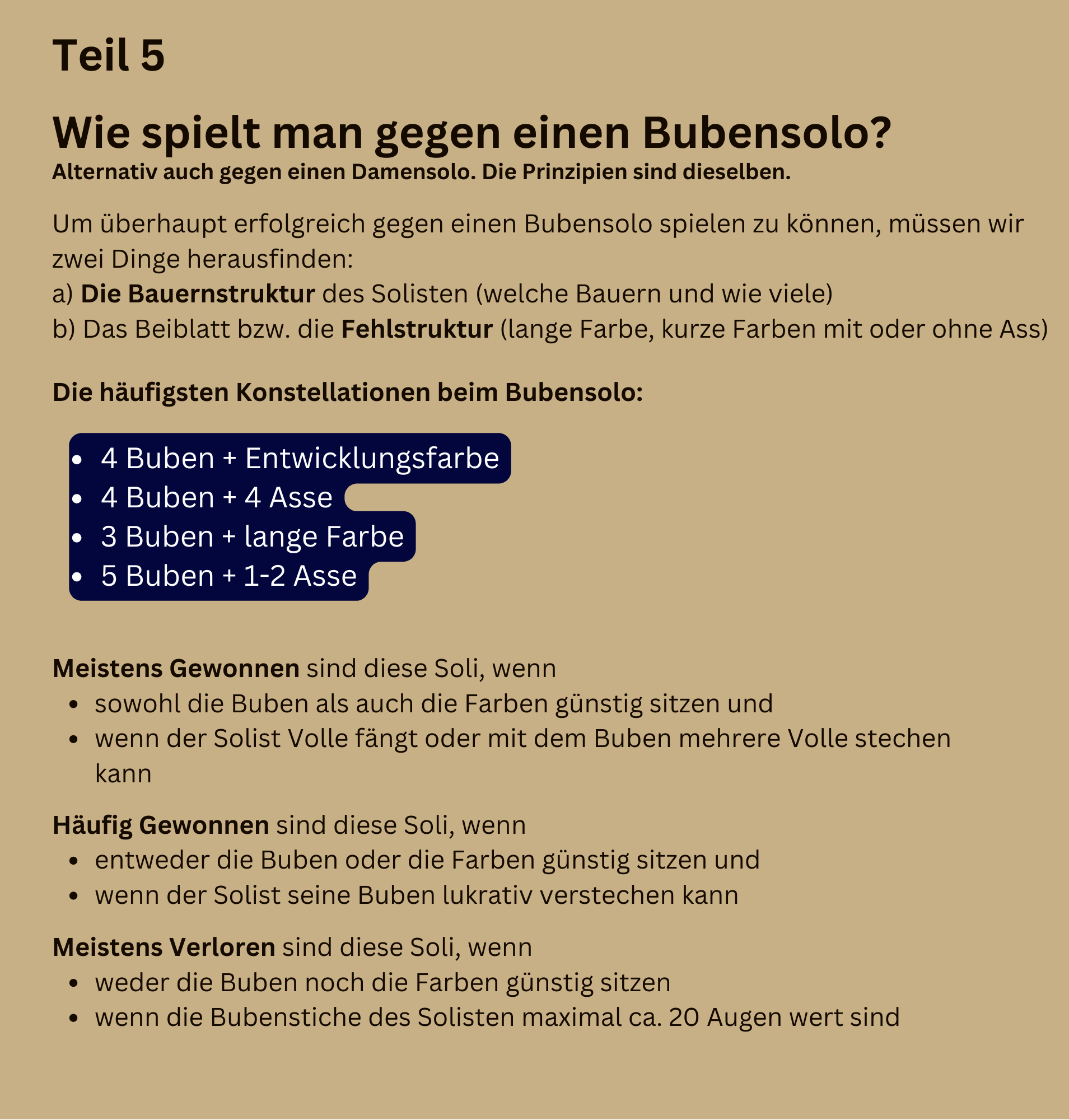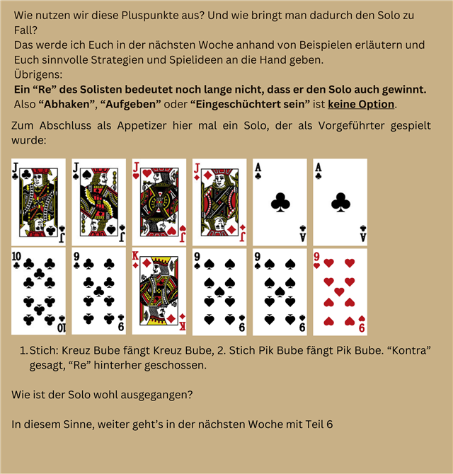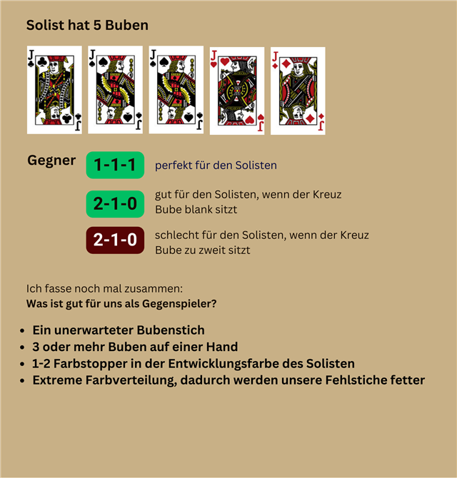 Liebe Leser, in der heutigen Ausgabe beschäftigen wir uns weiter mit dem Sologegenspiel. Diesmal geht's um Buben bzw. Damensoli. Ich zeige Euch als Einführung verschiedene Solokonstellationen und mögliche Bubenverteilungen. Was ist anders als beim Spiel gegen einen Fleischlosen?
