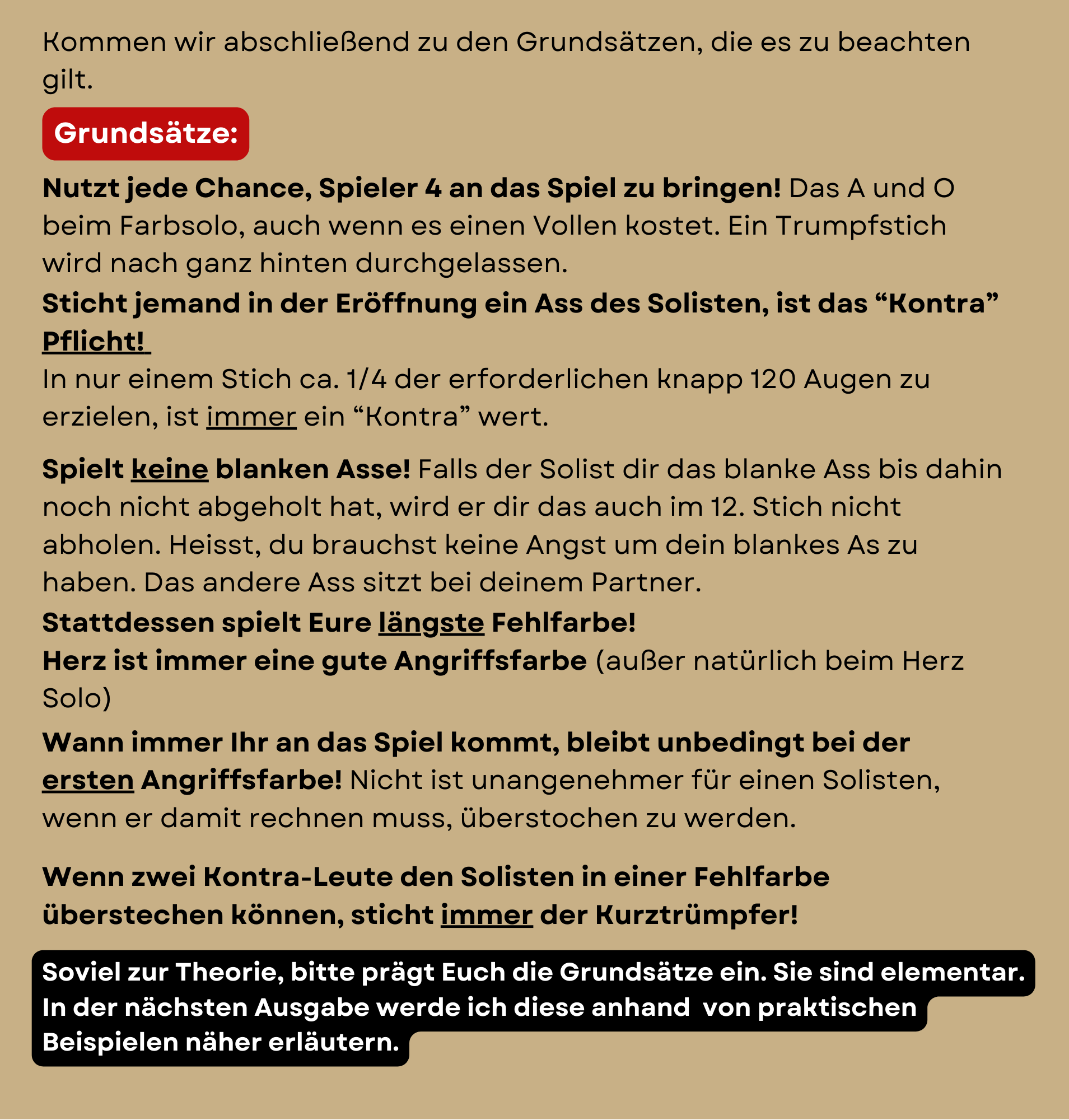 in dieser Ausgabe klären wir die Frage "Wie spielt man gegen Farbsoli?". Ich erläutere erst einmal "nur" die allgemeinen, theoretischen Grundsätze. In der nächsten Ausgabe vertiefen wir diese anhand von praktischen Beispielen.