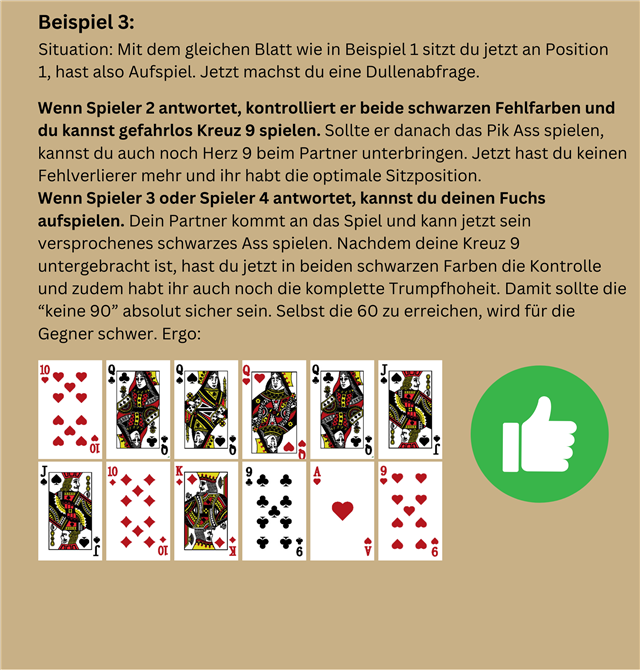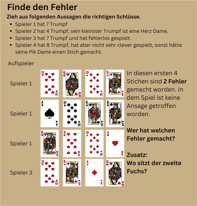 Lösung: Ein Spielfehler war aus den gegebenen Angaben nicht zu erkennen, also ist die Wahrscheinlichkeit eines regeltechnischen Fehlers recht hoch. Und siehe da, genauso ist es. Wenn man einmal die Trümpfe der Kontraleute zusammen rechnet (3+3+7), kommt man auf 13 Trümpfe. Da der Solist mit seinen 12 Karten auch nur 12 Trumpf haben kann, kommen wir in Summe auf 25 Trumpf. Also ein Trumpf fehlt. Es ist stark zu vermuten, dass entweder Spieler 2 oder Spieler 3 nicht bedient hat.