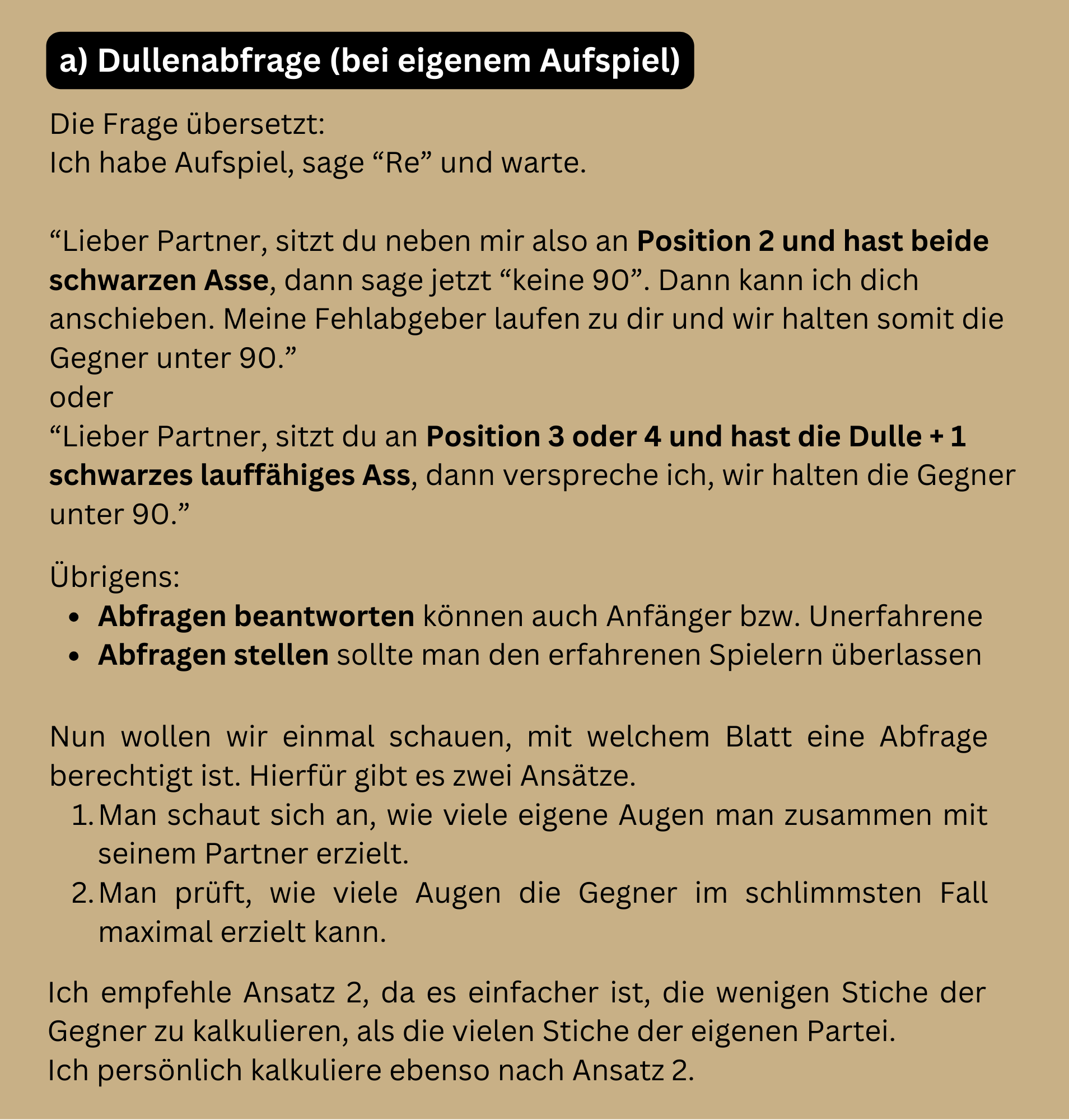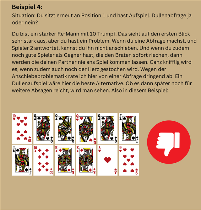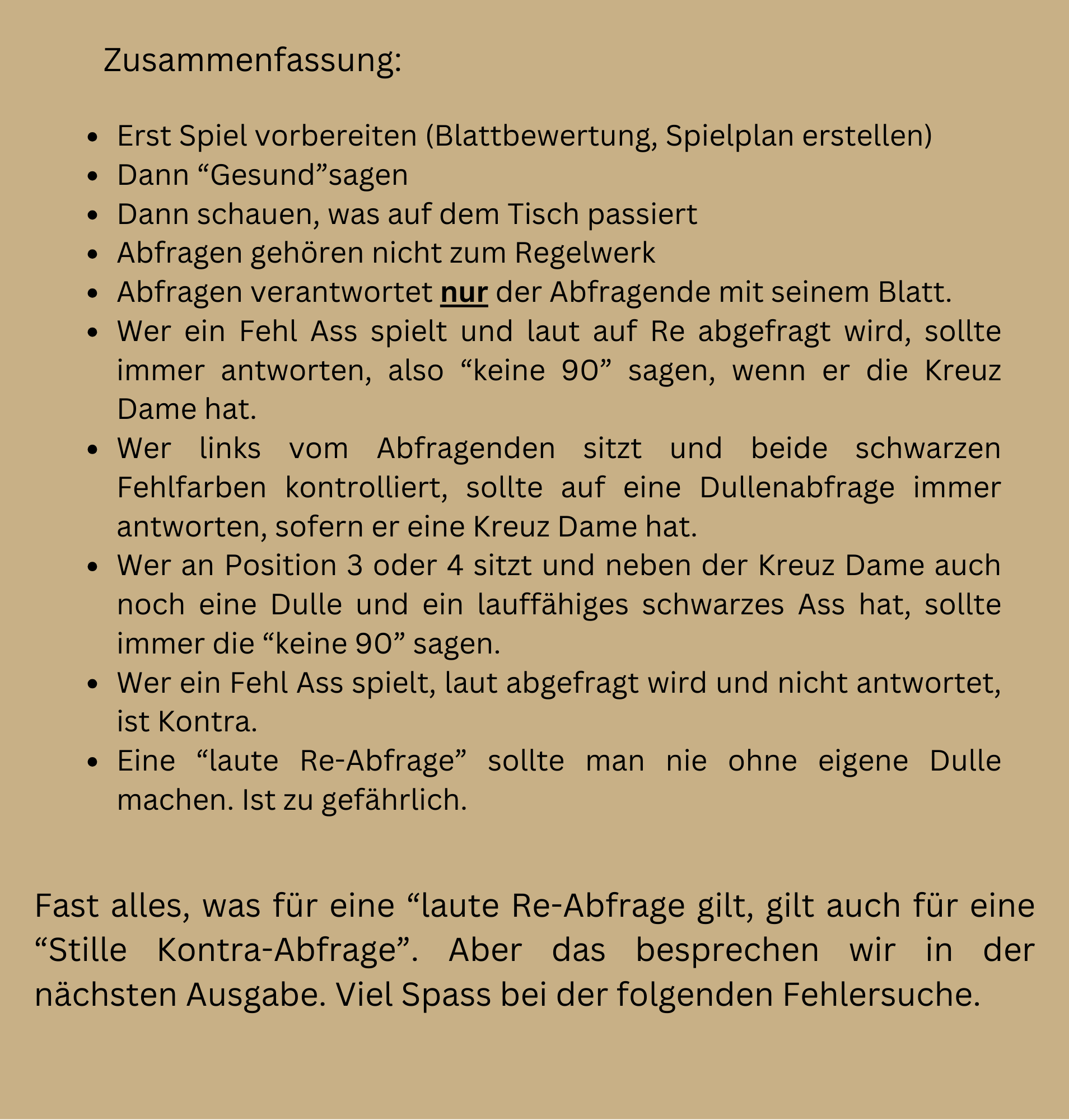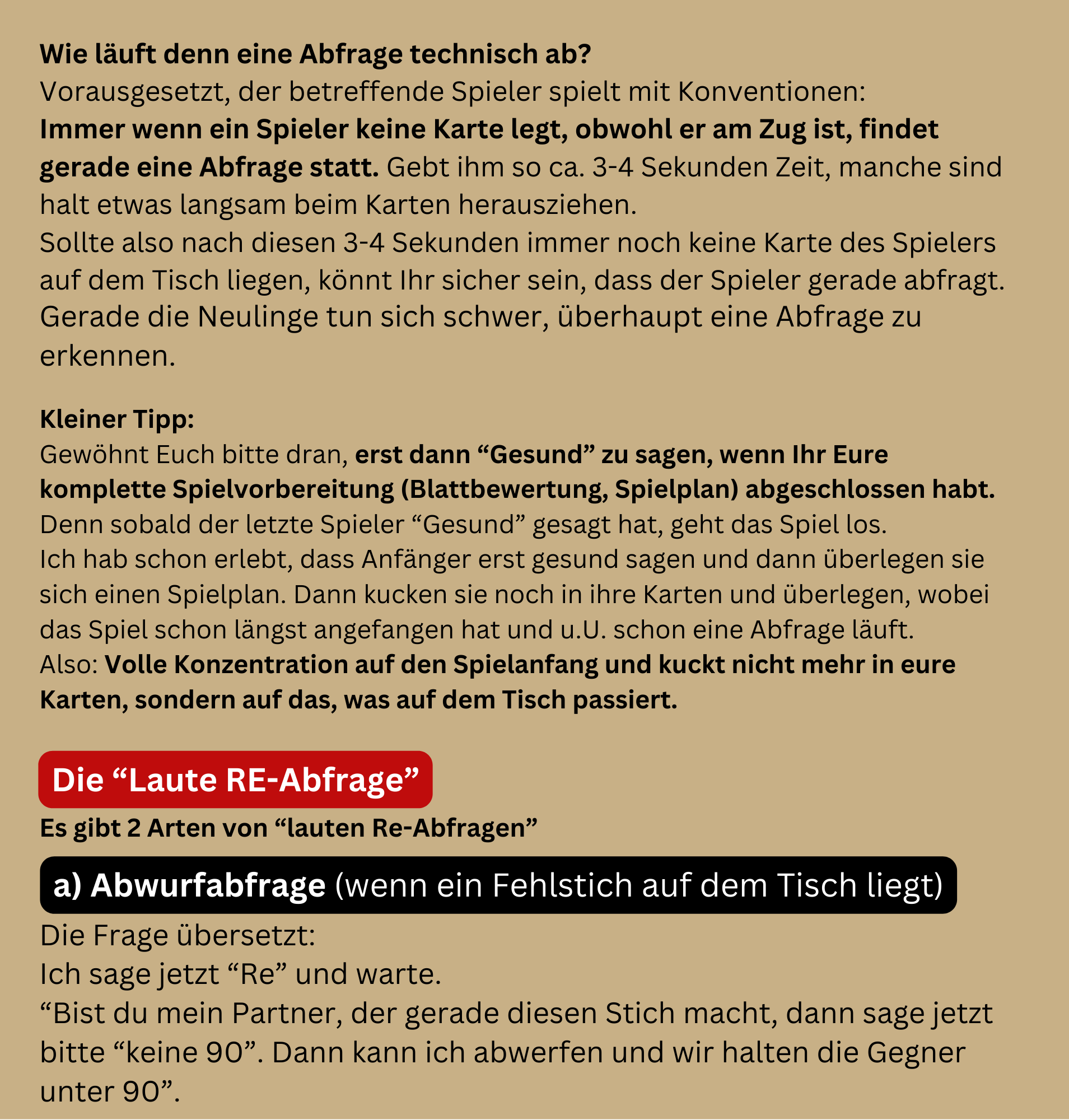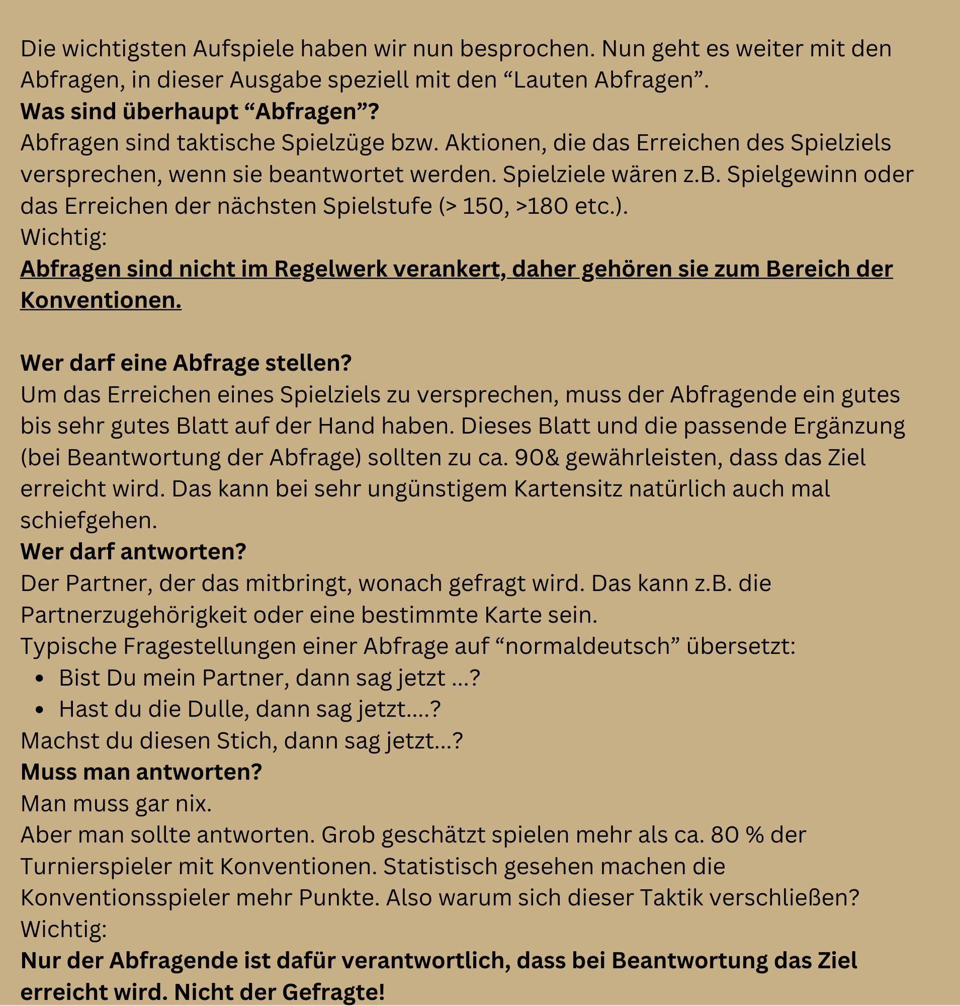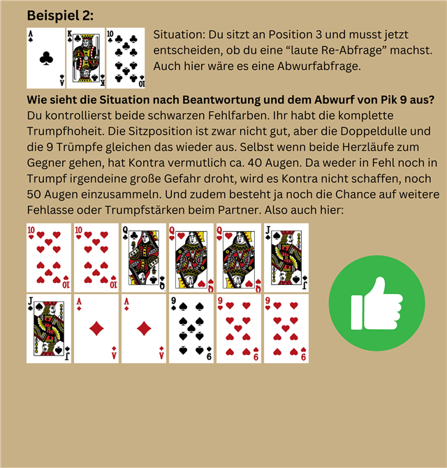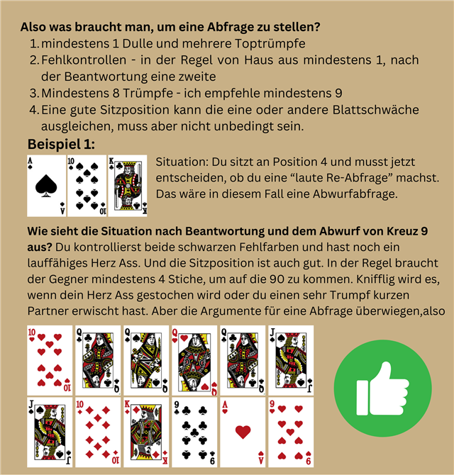 in dieser Ausgabe werden wir uns mit der "lauten Re-Abfrage" beschäftigen. Was sind Abfragen? Wer darf/sollte antworten? Mit welchem Blatt darf man eine Abfrage stellen?