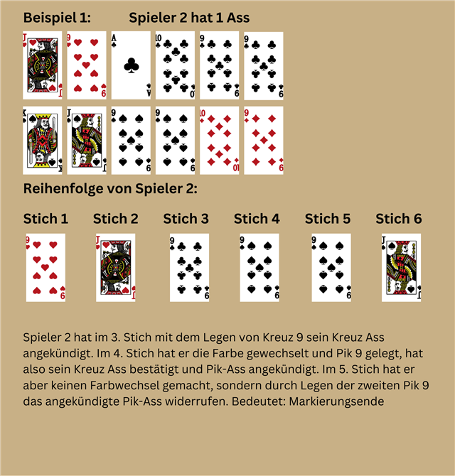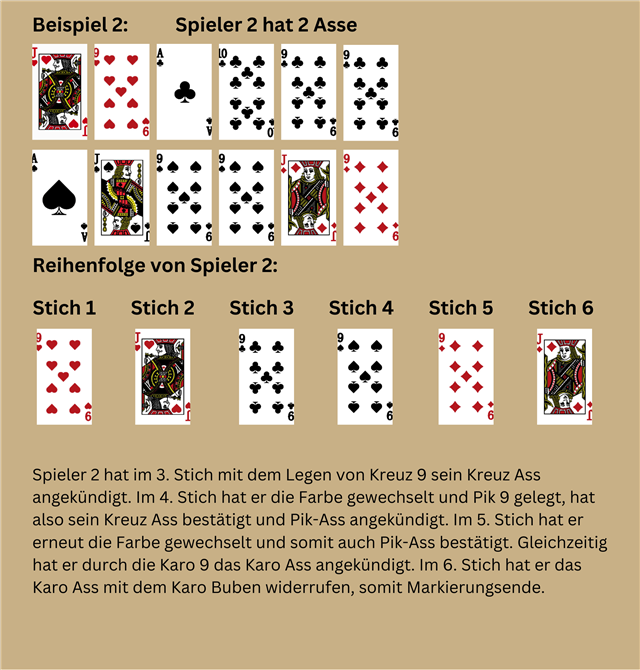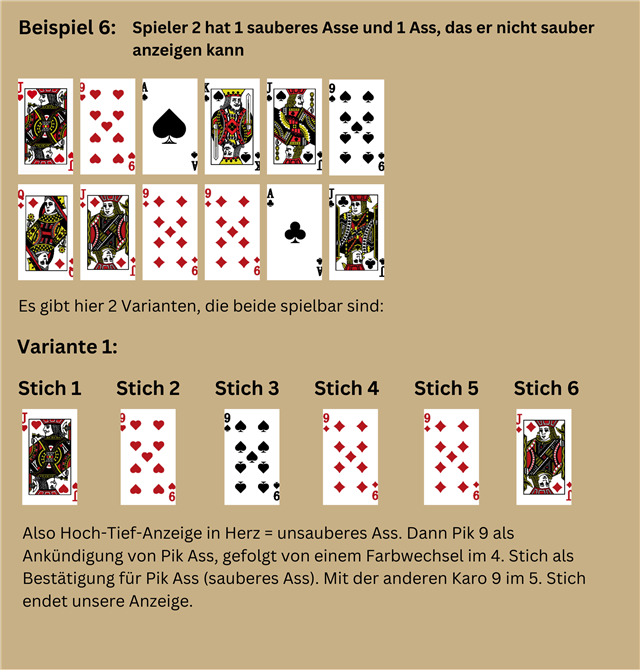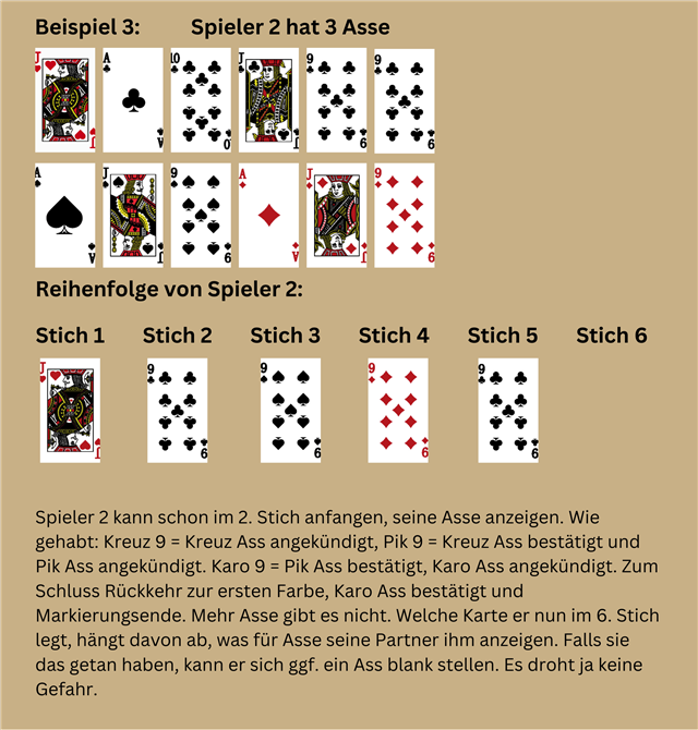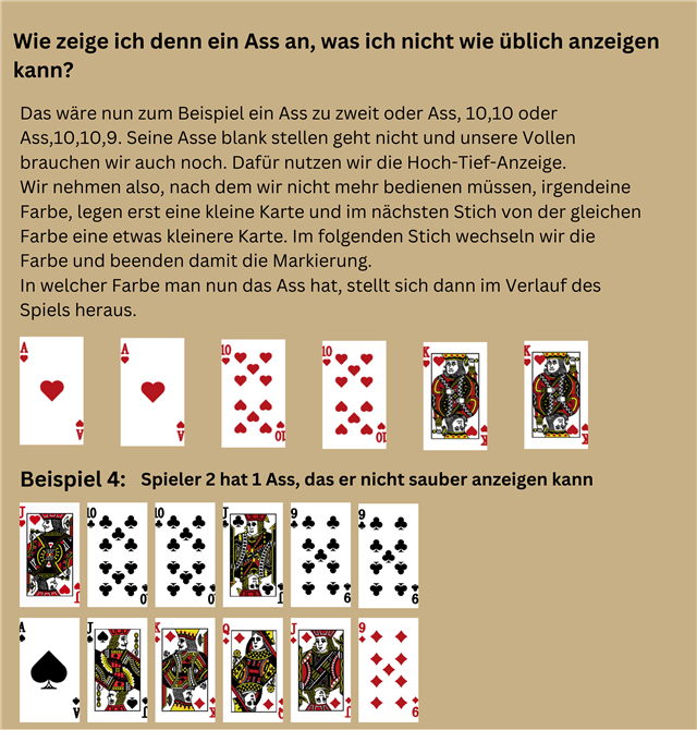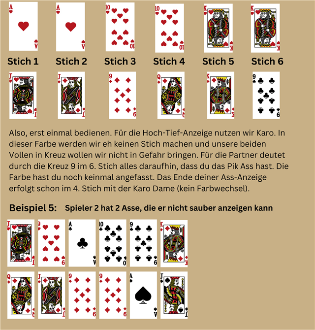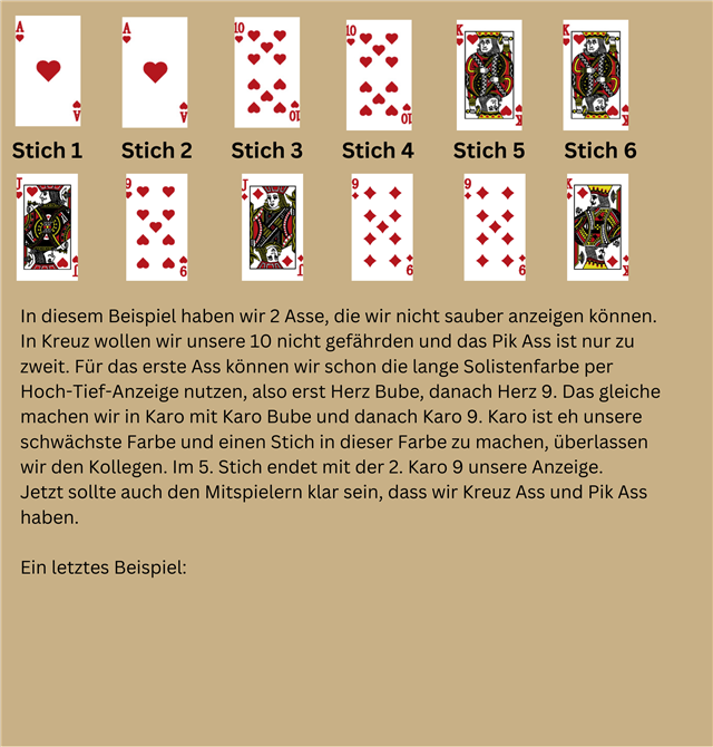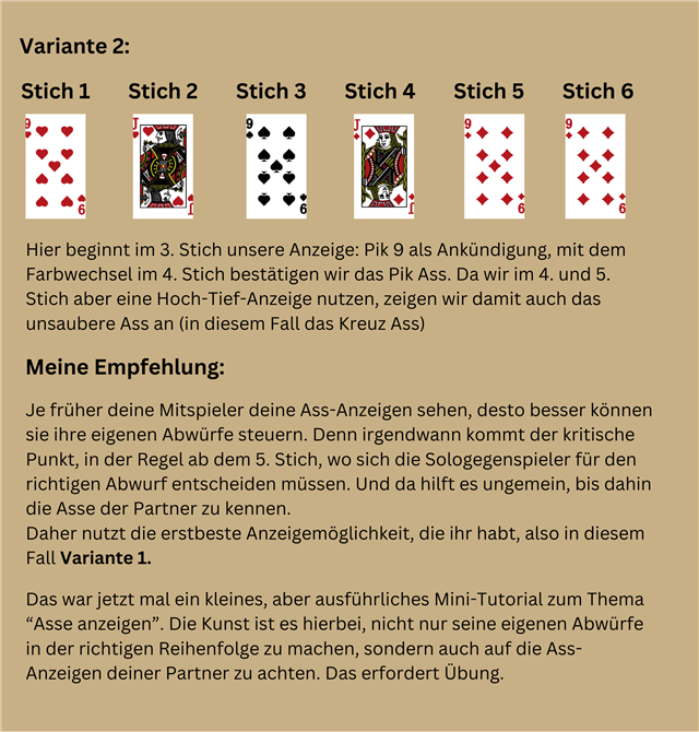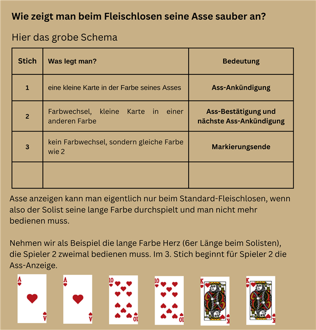 in der heutigen Ausgabe befassen wir uns mit den Konventionen im Solo. Eines der grundlegenden und wichtigen Konventionen ist das "Asse anzeigen" beim Fleischlosen. Manchmal einfach, manchmal tricky, aber wenn man das Grundprinzip verstanden hat, ist es nur noch eine Frage der Übung.