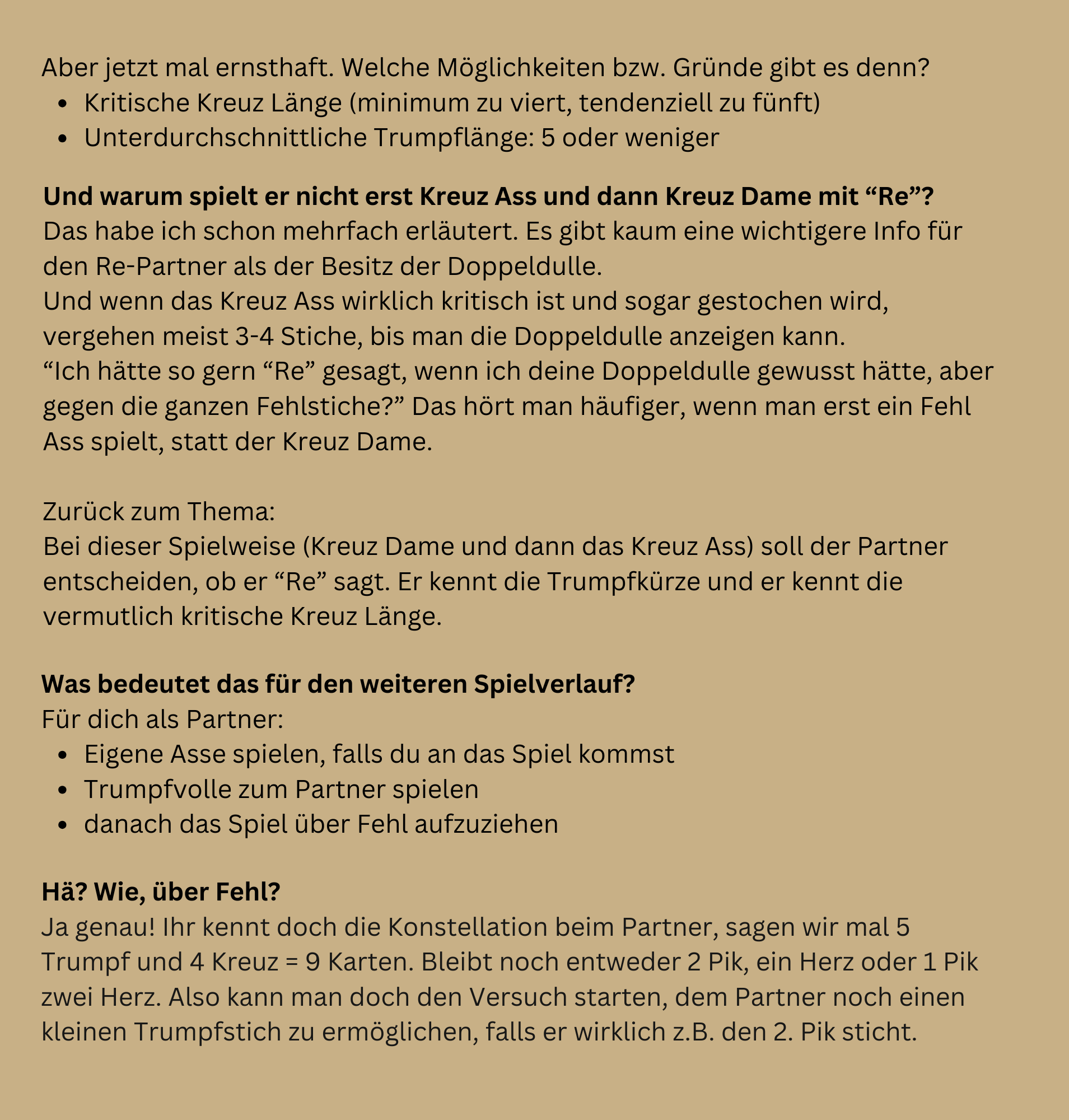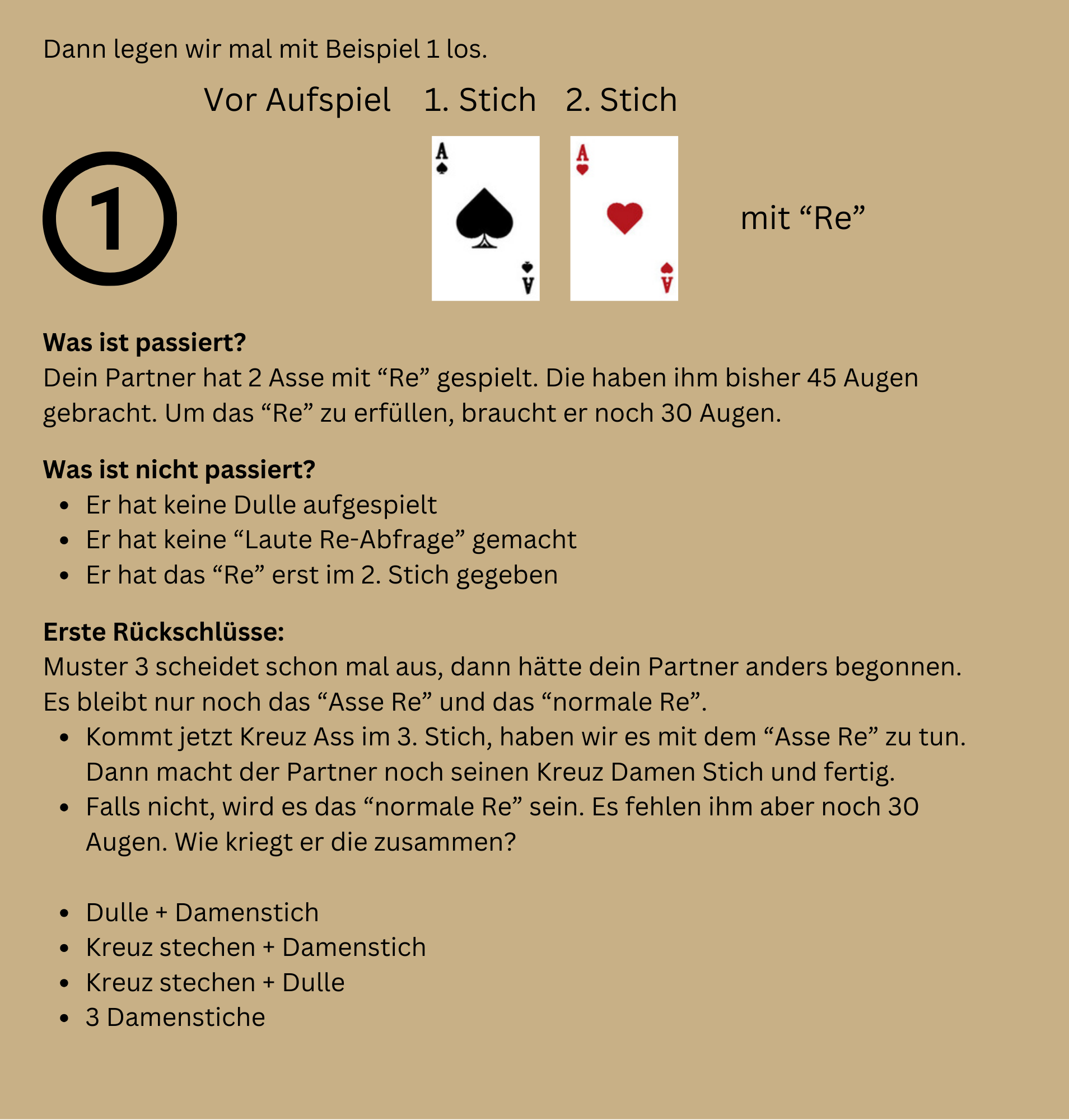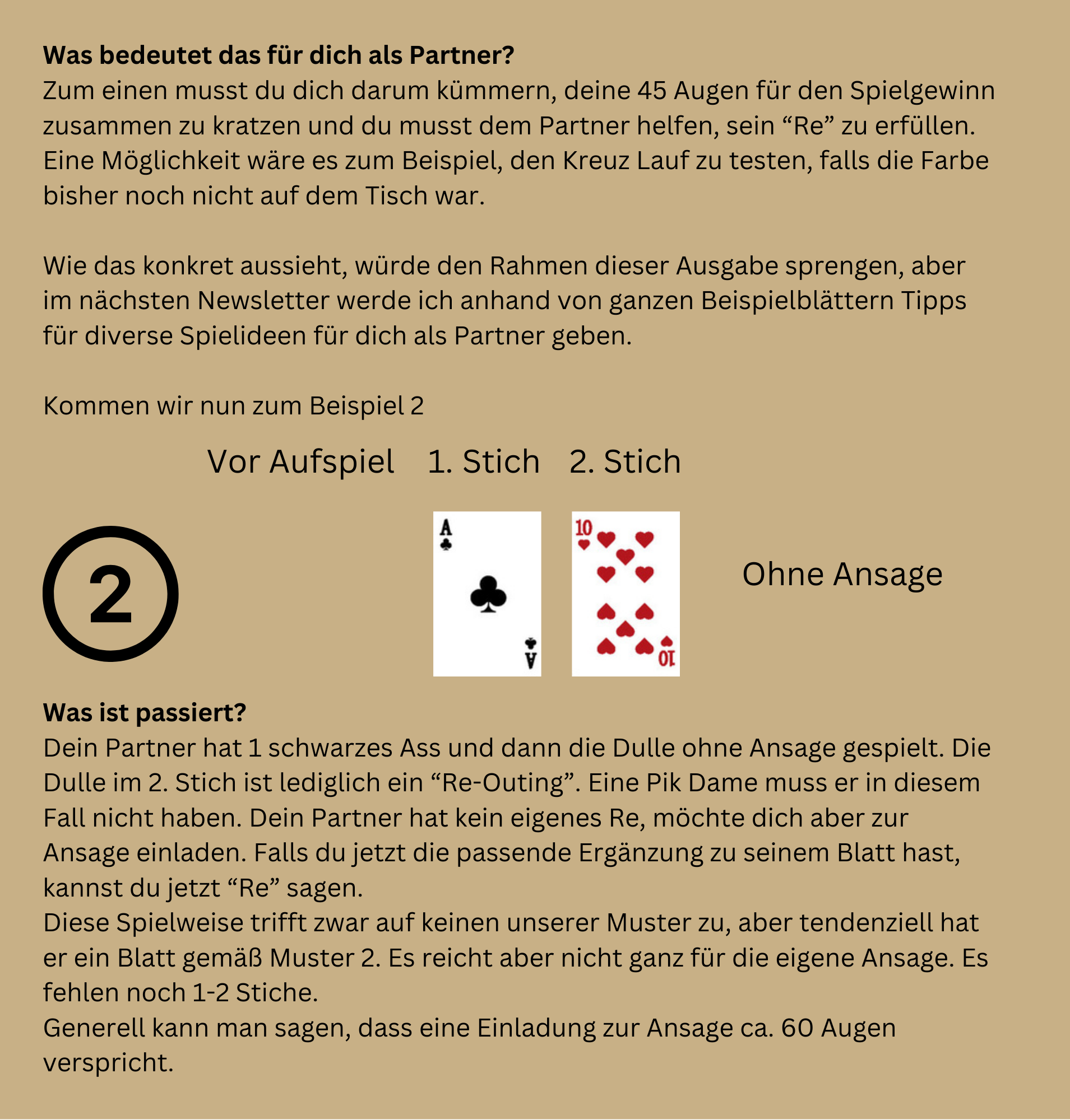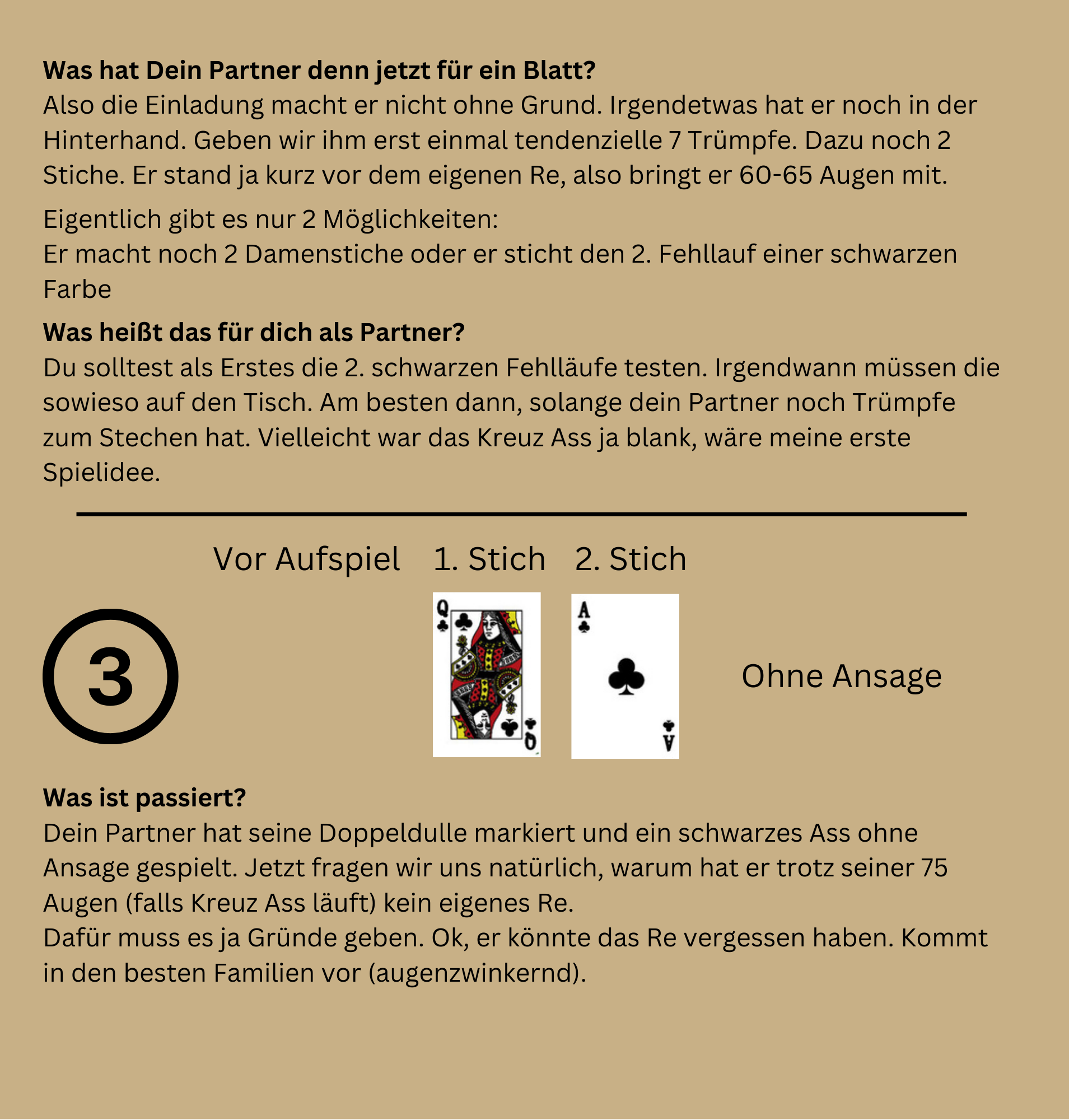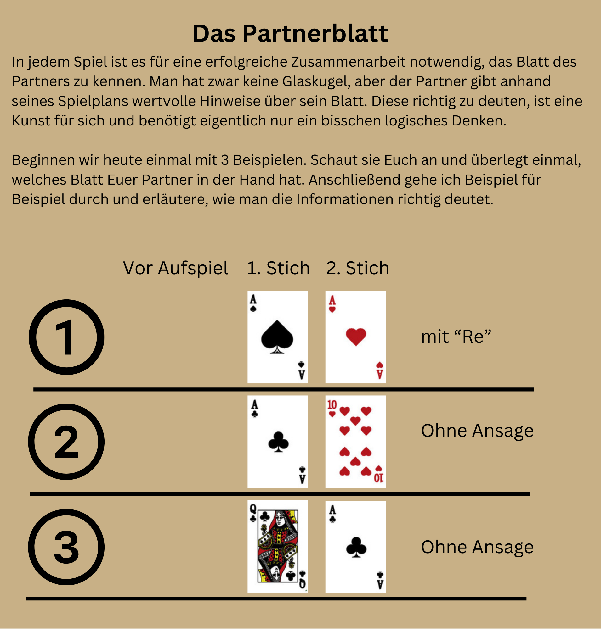 Liebe Leser, in der heutigen Ausgabe beschäftigen wir uns mit dem "Lesen des Partnerblattes". Die richtige Deutung des Partnerblattes entscheidet oft über den Gewinn eines Spiels. So viele unterschiedliche Blattkonstellationen gibt es eigentlich gar nicht. Aber die Herausforderung liegt vermutlich in der Spiellogik. Wenn er das und das spielt, dann hat er das und das Blatt. Ich hoffe, heute mal ein bisschen Licht ins Dunkle zu bringen und wünsche viel Spaß beim Lesen, Gruß Hermann |