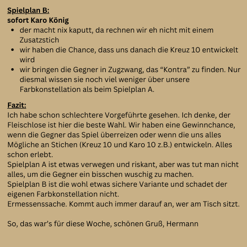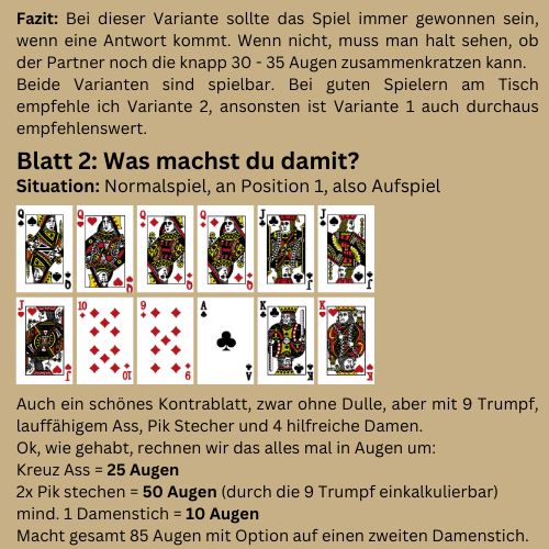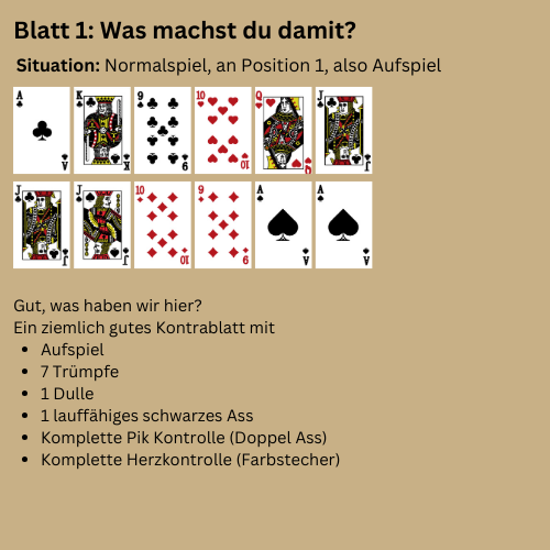 Liebe Leser, in der heutigen Ausgabe werde ich näher auf die Denksportaufgaben eingehen und Ideen zeigen, wie man diese Blätter behandeln könnte. Denn je häufiger man bestimmte Kartenkonstellationen sieht, desto eher prägen sich auch die entsprechenden Spielpläne ein. Genau das ist Sinn und Zweck der Übung.