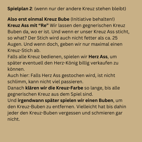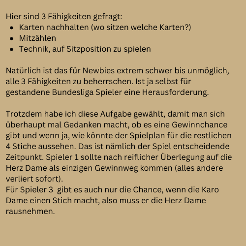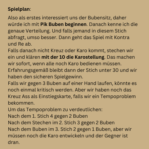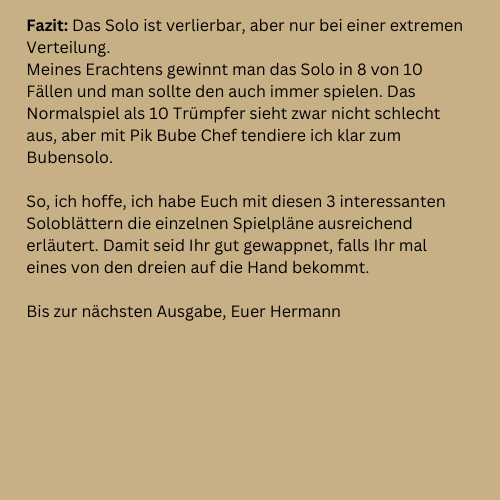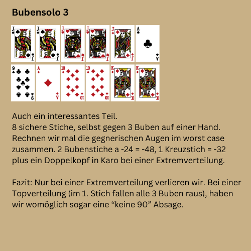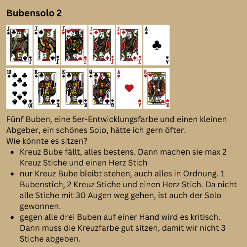 Liebe Leser, in der heutigen Ausgabe löse ich die Kurz und Knackig Aufgabe der letzten Ausgabe auf und zeige Euch danach drei interessante Bubensoli. Worauf muss man achten? Welcher Spielpläne für welche Verteilung? Und auch den einen oder anderen Tipp.