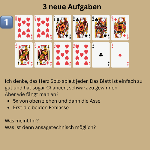 Übrigens, wer in letzter Zeit bei Turnieren oder sonst wo ein interessantes Blatt hatte und sich unsicher war, wie man es hätte spielen sollen. Immer her damit!