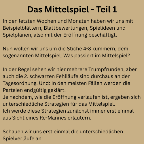 wie angekündigt beginne ich heute mit dem Thema "Mittelspiel". In dieser Spielphase werden Spiele zwar noch nicht gewonnen, aber häufig verloren. Starten möchte ich mit einigen grundlegenden Erläuterungen, bevor ich dann in der nächsten Woche mit konkreten Beispielen die einzelnen Strategien vertiefe.
