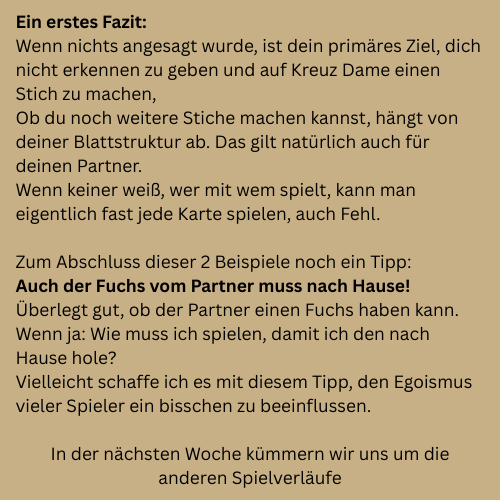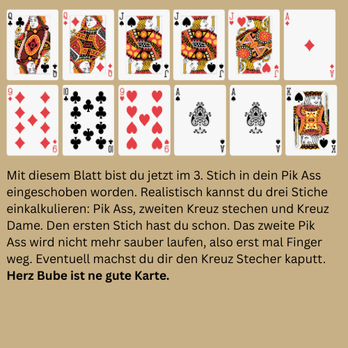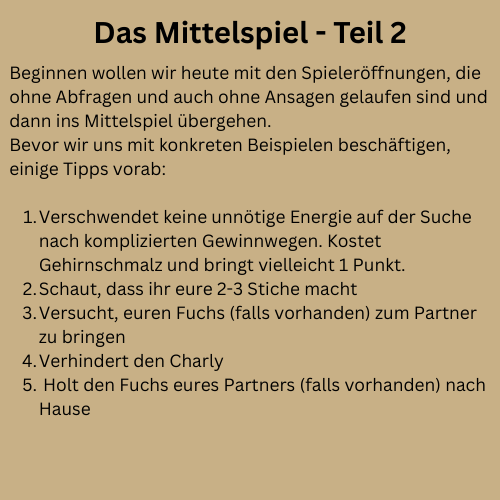 heute habe ich zwei Beispiele, wie man sich mit einem schlechten Blatt verhält, wenn nichts gesagt wurde. Was ist wichtig? Worauf kommt es an? Da das Thema "Mittelspiel" an sich sehr komplex ist, teile ich das in kleinere Häppchen auf.