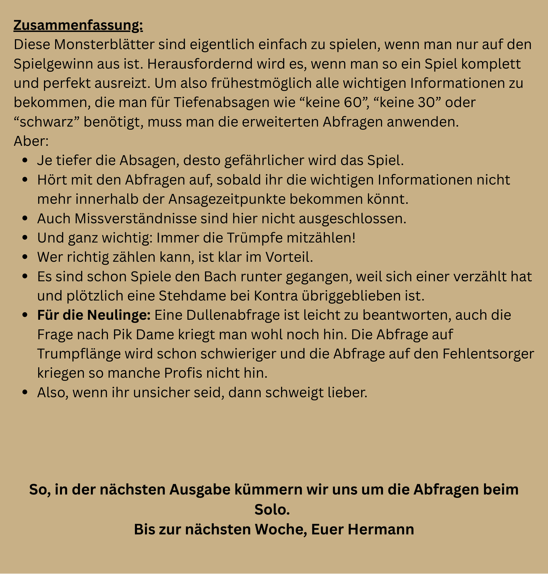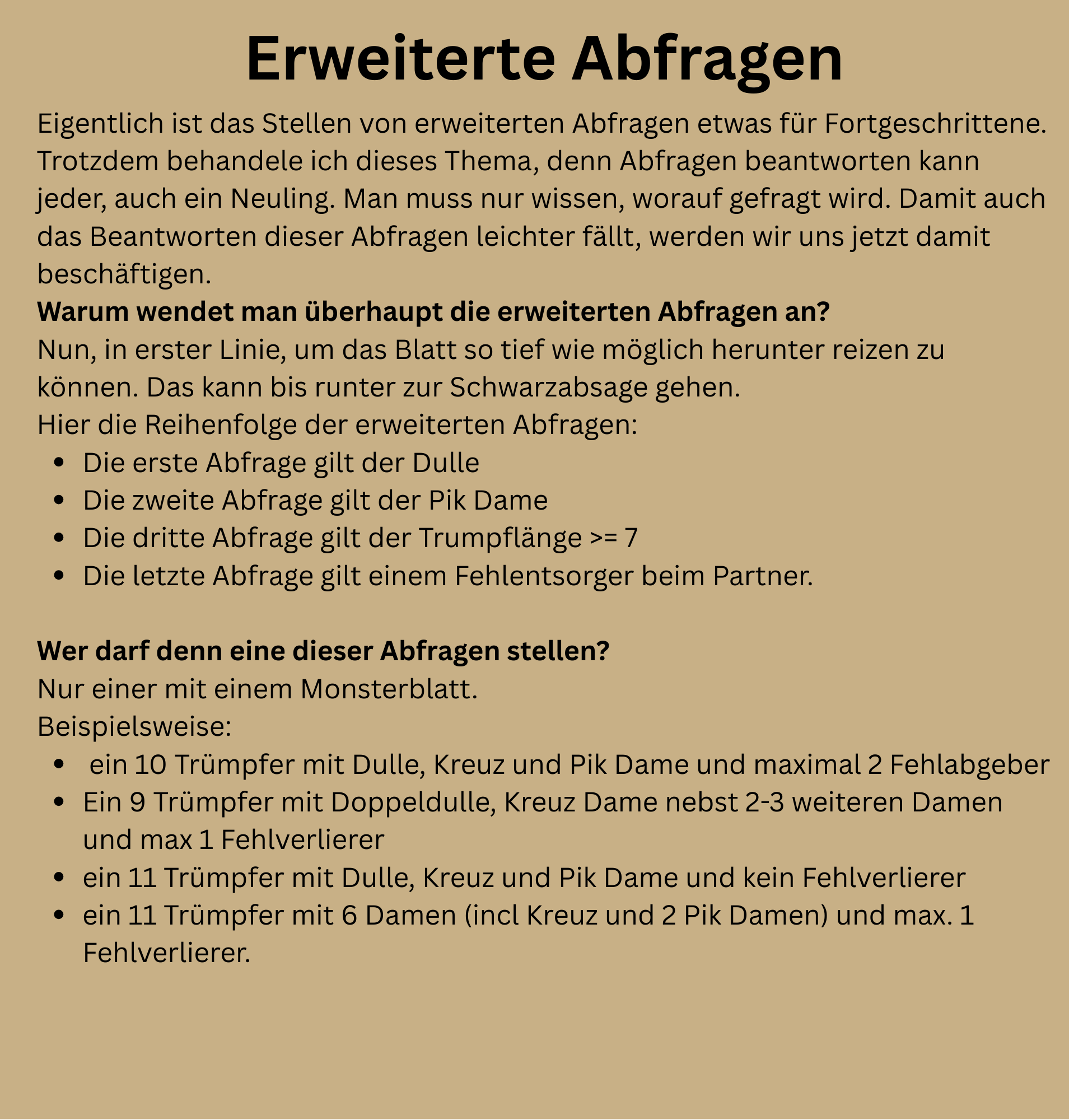heute wollen wir uns einmal mit den "erweiterten Abfrage", eine der Königsdisziplinen, beschäftigen, bevor wir uns ab der nächsten Woche die Abfragen beim Solo behandeln.