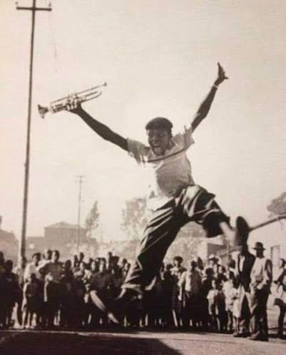 Hugh Masekela jumping for joy after receiving trumpet from Louis Armstrong.