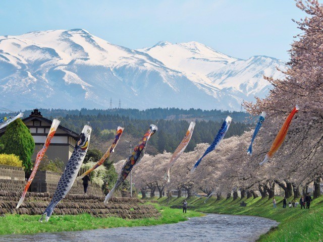 In late April, cherry blossoms, koinobori (carp streamers) and snow‑covered peaks create a striking spring scene at Nakayama River Park in Yamagata Prefecture. |
