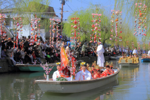 Yanagawa in Fukuoka is decorated with colourful sagemon decorations each year for Hinamatsuri (Girls’ Day). Go on a sagemon meguri to admire hina doll and sagemon displays, and enjoy the lively Ohinasama Water Parade.