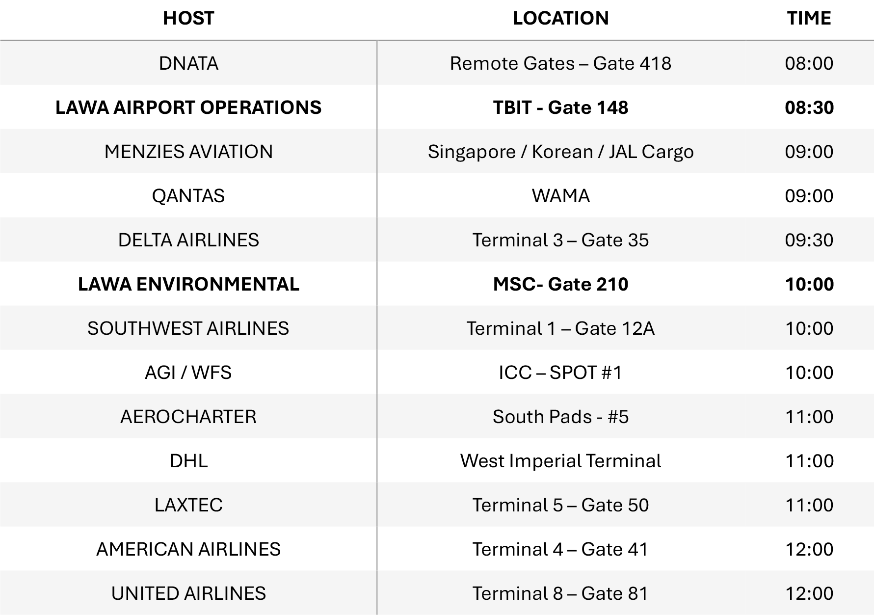 Join us in celebrating Earth Day on Tuesday, April 22, by participating in Foreign Object Debris (FOD) Walks across the Air Operations Area (AOA). This event is open to all badge holders with Airfield Access. Please arrive at the designated location wearing your reflective vest for the pre-walk safety briefing. We thank the following airlines, service providers, consortiums, and leaseholders for hosting the FOD Walks. |