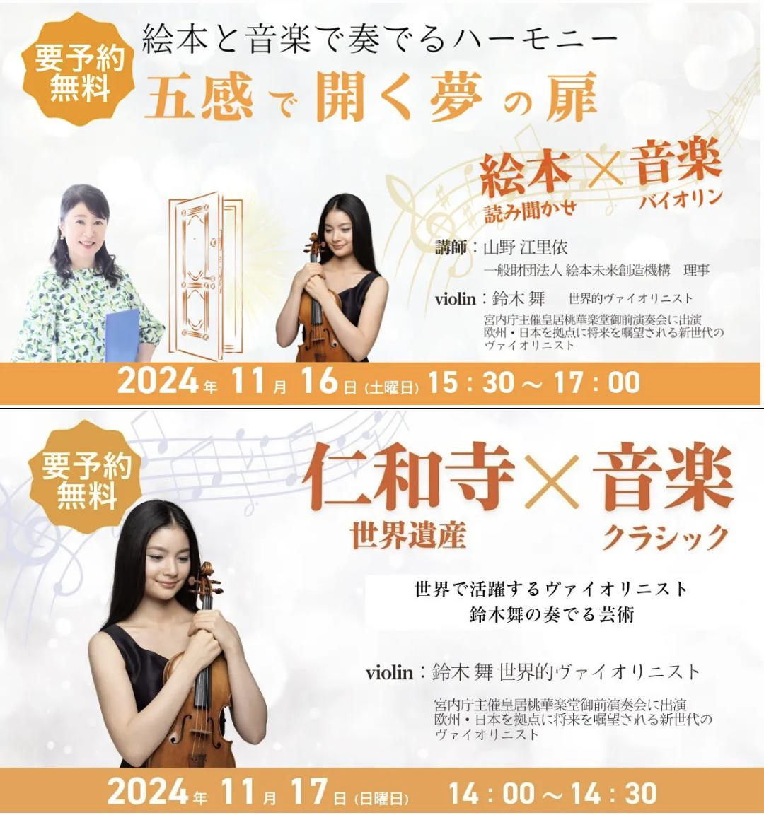 16日と17日には、京都の古刹・仁和寺にて演奏の機会を賜りました。千年の歴史を重ねた寺院の厳かな雰囲気のなか、歴史と響き合う音楽を絵本とのコラボレーションでお届けいたします。紅葉の美しい京都で、静謐な時の流れと共に音楽を楽しんでいただければ幸いです。