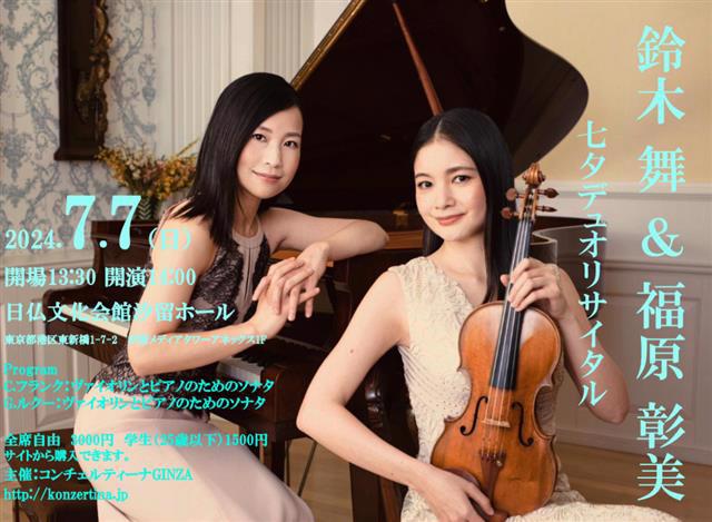 7月は、7日の七夕の日に福原彰美さんとリサイタルです。フランクとルクーのロマンチックな二つのソナタを取り上げます。深い情感と美しいメロディが特徴で、まさに七夕の夜にふさわしいプログラム。ぜひ会場でその魅力を直接聴きにいらしてください。