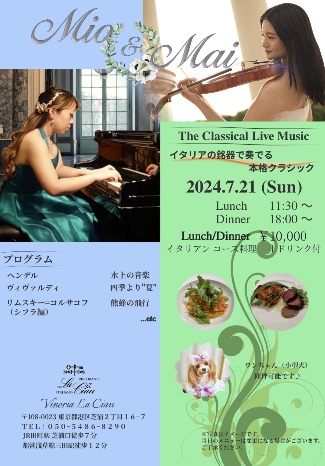 続いて、21日にはレストランにて開催されるランチとディナーコンサート。美味しいお食事と共に、リラックスした雰囲気の中で演奏をお楽しみください。