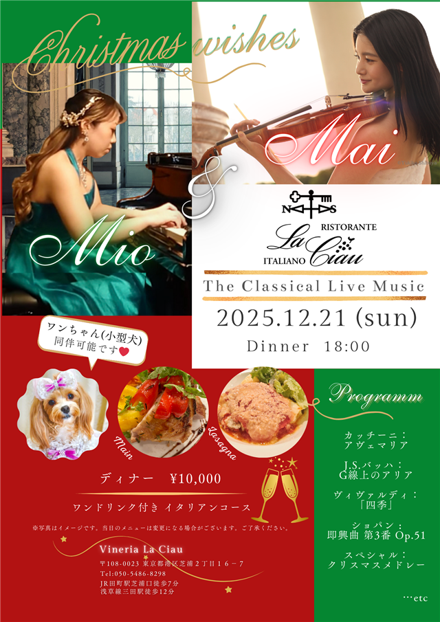 わんちゃんも同伴OKという温かい雰囲気の中、馬渡シェフが腕をふるうコース料理とともに、本格的なクラシックを気軽にお楽しみください。
