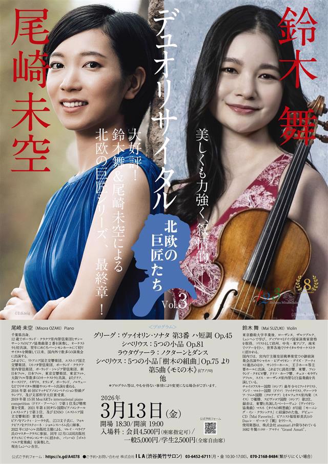 やまびこホールの美しい自然に抱かれた空間での三公演。ピアノの岡田奏さん、チェロの笹沼樹さんとのトリオで、初めての組み合わせということもあり、どんな化学反応が生まれるのか今からとても楽しみにしています。