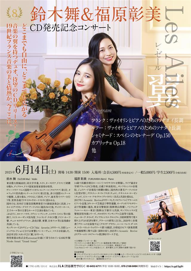 ヴァイオリニスト鈴木 舞とピアニスト福原彰美が満を持して録音!フランクとルクーの傑作ヴァイオリン・ソナタ2曲を、新結成デュオ「Les Ailes(レ・ゼール)」の記念として、長年磨き上げた渾身の演奏で届ける!