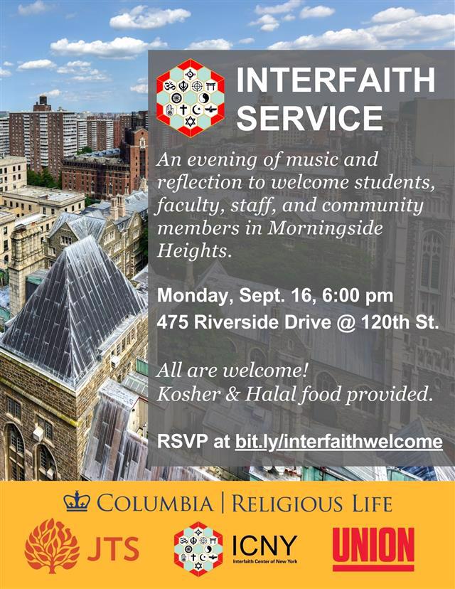 Join the Interfaith Center of New York, Columbia University's Earl Hall Center for Religious Life, the Jewish Theological Seminary, and Union Theological Seminary for an Interfaith Service and Community Gathering. It will be an evening of sacred music and reflection to welcome students, faculty, staff, and community members in Morningside Heights.