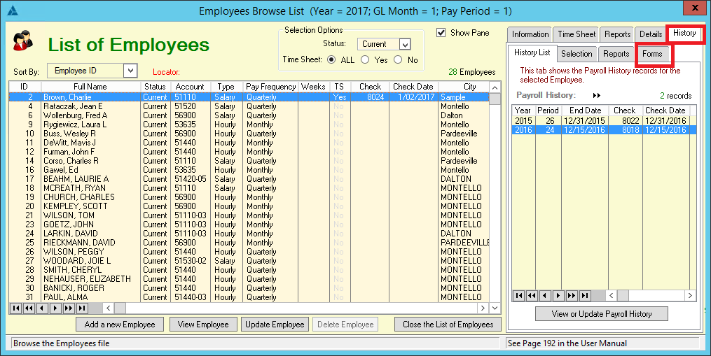 Once you have selected the List of Employees, on the right side of the screen, you need to select the History Tab. This will open the second set of tabs and you will need to chose the Forms tab. |