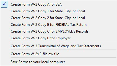 Create each Form Copy in order. Preview and exit. Then create the next form on the list. A checkmark will show where you are in the list. After all are completed - and the W-3, then click on the last option: "Save Forms to your local computer." The W-2s and W-3 will all be saved to your Marge Report Files folder so you can print more efficiently from your local computer. |