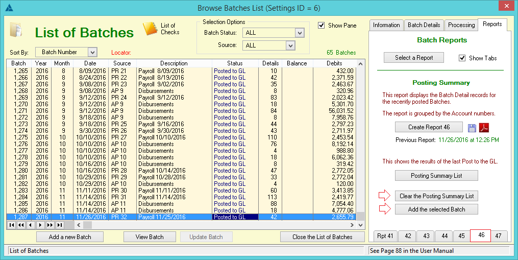 Previously when running Report 46, it would simply supply the details of the latest batches posted. Because of the automatic validation and posting feature, the batches were not being retained for posting. Now, by Clearing the Posting Summary List, you can start fresh and select exactly which batches should be included in the report. If you want all receipts for the year, or payroll for the month or disbursements for a quarter, you can build those reports with ease. |