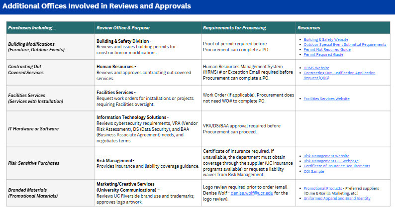Before initiating a purchase, check whether your goods or services require special reviews, permits, or additional departmental approvals. Procurement cannot issue a purchase order until required documentation is complete.