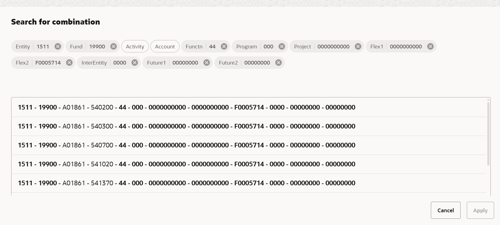 The Search for Combination screen only displays COA combinations that have already been used on a requisition. If a valid COA has not yet been used, it won’t appear in the results, and users will see a "No Matches Found" message. This does not mean the COA is invalid—it simply has not been used before. When this happens, enter the COA directly instead of relying on the search feature.