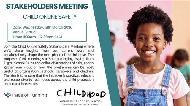 Join the interactive Child Online Safety Stakeholders Meeting, where Tales of Turning will share emerging insights from their Digital School Clubs and online observations of risks, and gather your input on how the programme can be most useful to organisations, schools, caregivers and children. The aim is to ensure that the initiative is practical, relevant and responsive to real needs across the child protection and education sectors.