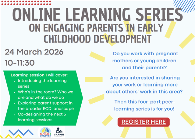 To bridge this gap , Families4Children, in partnership with SAPPIN, invites you to the first of a four-part online learning series on engaging parents in early childhood development.
