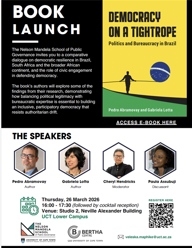 The Nelson Mandela School of Public Governance and its partners (Open Society Foundation and the Bertha Centre) invite you to a book launch and dialogue on democratic resilience in Brazil, South Africa, and the broader African continent, and the role of civic engagement in defending democracy.