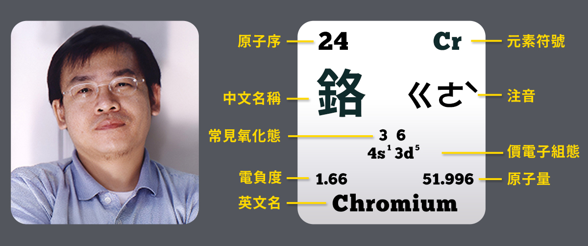「鉻」元素的化學符號為Cr,原子序數為24,在VIB族元素中排行首位。「鉻」元素是一種銀白色的金屬,質地堅硬但較脆,表面帶光澤,「鉻」的化學性質穩定,在水、空氣中不生鏽。「鉻」具有很高的熔點攝氏1907度(所以「鉻」可以耐很高的溫度)和很高的沸點攝氏2671度。「鉻」無臭、無味,同時具高〝延展性〞(Ductility)。