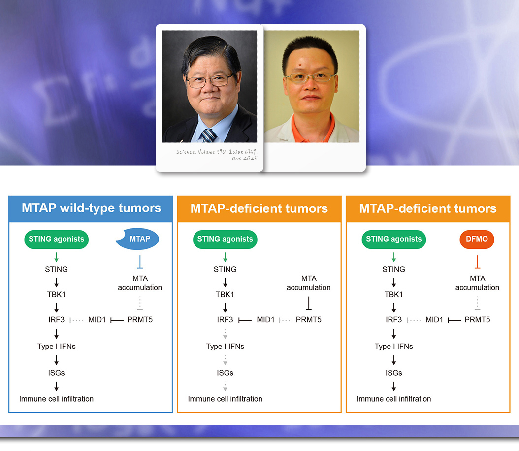 本研究旨在探討細胞質核酸感應 (Cytosolic Nucleic Acid Sensing) 途徑作為癌症免疫療法的潛在靶點,並聚焦於STING激動劑在動物模型與人類臨床應用間療效不一的根本原因。研究團隊發現,人類腫瘤中常見的甲基硫腺苷磷酸化酶 (MTAP) 基因純合子缺失,構建了一種抑制性的腫瘤微環境,是導致腫瘤對STING激動劑產生抵抗性的關鍵因素。此抵抗機制依賴於MTAP缺失所導致的代謝物 5'-甲基硫腺苷 (MTA) 大量累積。累積的MTA進而對蛋白精氨酸甲基轉移酶 5 (PRMT5) 產生競爭性抑制。PRMT5活性受損則導致核心免疫調節因子干擾素調節因子3 (IRF3) 的表達顯著下調,從根本上阻礙了細胞質核酸感應通路,削弱了STING激動劑誘導的抗腫瘤免疫反應。為進一步闡明此代謝機制,研究進行了詳盡的細胞與動物模型實驗,並確立了MTAP-MTA-PRMT5-IRF3的機制鏈條。更具臨床轉化價值的是,本研究提出以DFMO靶向多胺生物合成 (polyamine biosynthesis) 的策略,可有效逆轉IRF3的下調現象,成功恢復MTAP缺失腫瘤對於STING激動劑的敏感性。總結而言,本研究不僅揭示了MTAP基因狀態可作為預測患者對STING激動劑療法反應的生物標誌物,更提供了一種具高度操作性與機制創新的聯合治療選項:將STING激動劑與靶向多胺生物合成的藥物聯用,以克服MTAP缺失腫瘤的免疫抵抗,對於拓展癌症免疫治療的範疇與療效皆具有重要的參考價值。