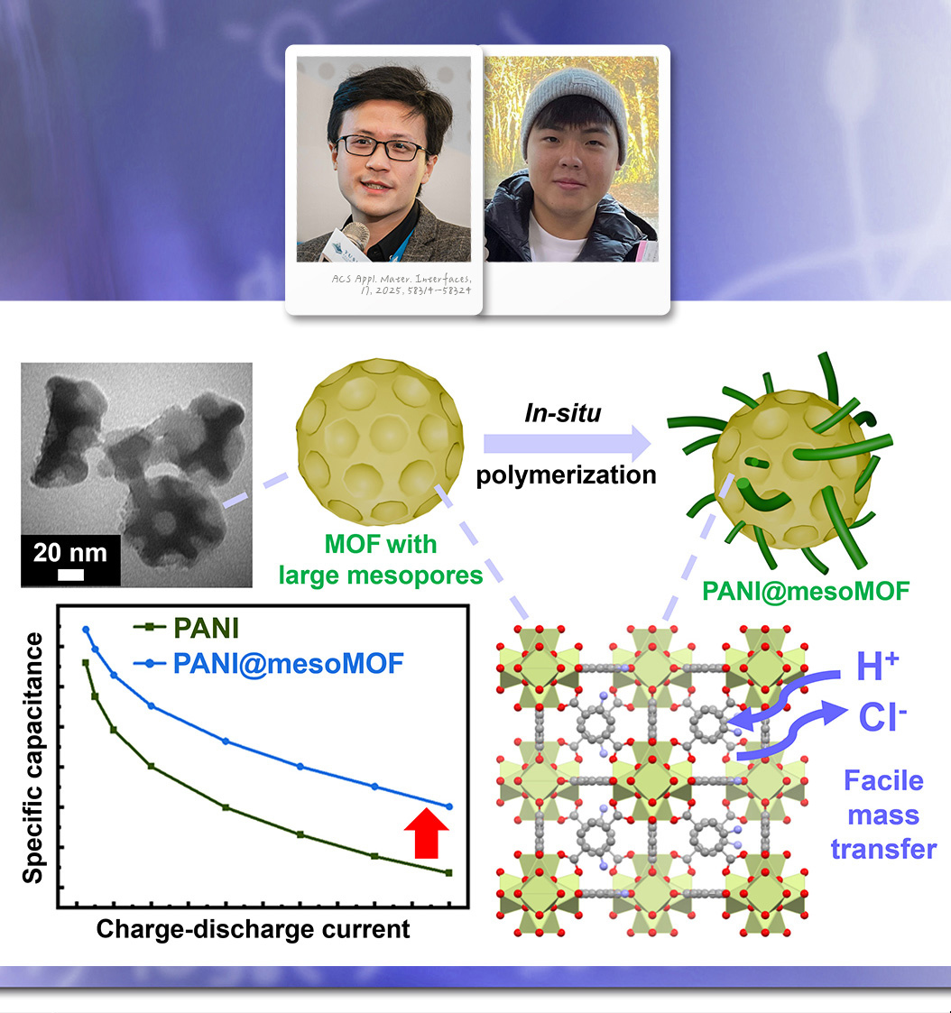 本研究中,我們利用「軟模板輔助法」合成了一系列在酸性水溶液中相當穩定的MOF—UiO-66-NH2。所得三種MOFs皆具有UiO-66-NH2晶體結構得來之微孔(約1.1奈米),並具有幾乎相同的微孔體積與比表面積,但分別含有大中孔(約15奈米)、小中孔(約5-6奈米)以及無中孔。這些MOFs被作為添加劑加入苯胺聚合反應,進而得到一系列具可調控孔洞結構與導電性的MOF-PANI奈米複合材料。在酸性電解液中,具有大尺寸中孔的MOF所限縮之PANI可達到比純PANI更高的電容值。此外,三種被MOF限縮的PANI均展現比純PANI更佳的倍率性能,而倍率性能的趨勢與MOF的孔洞大小一致。本研究強調了當MOFs用於電化學應用時,分級孔結構及大尺寸中孔的重要性。未來可望將此「中孔促進效應」用於提升其他能源儲存與電催化系統之性能。