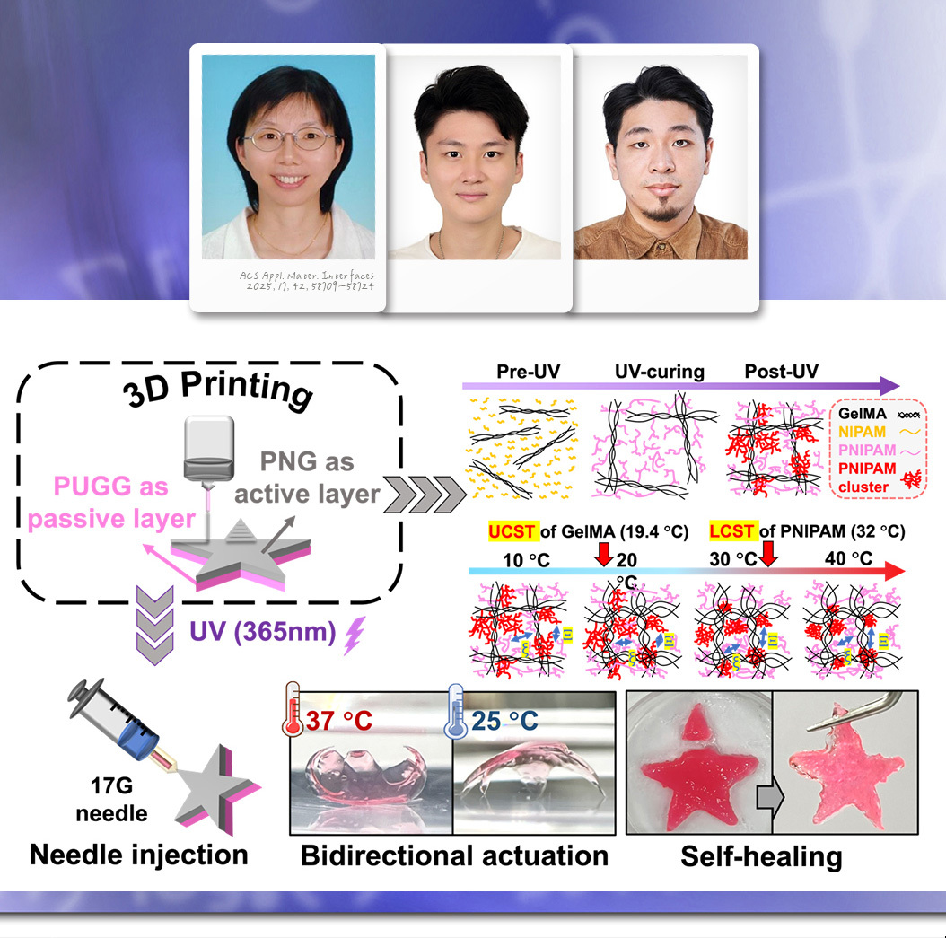 本研究的新型雙層水凝膠致動器,其主動層為兩種高分子PNIPAM與GelMA的複合網路(PNG)。在紫外光交聯後,GelMA 形成共價網絡提供結構支撐,而PNIPAM 鏈段則在網絡中互鎖形成團簇;在這些團簇內,PNIPAM 鏈段間存在可逆的物理互鎖作用,當水凝膠受到破壞時,鏈段能重新滲透並藉由氫鍵再度形成互鎖結構,使材料恢復結構與力學性能。這些化學交聯與物理互鎖的協同作用賦予 PNG 水凝膠韌性與彈性,可通過 17G 針頭注射後仍維持形狀與功能,展現結構穩定性。將此主動層PNG結合GelMA被動層組合列印成雙層水凝膠致動器,主動層於升溫時因 PNIPAM 收縮而產生體積變化,與被動層 GelMA 間形成應變不匹配並導致彎曲,同時累積內部應力。當溫度降低時,PNG 層重新溶脹並釋放應力,使彎曲方向反轉,形成穩定可逆的雙向致動行為。進一步將被動層GelMA更改為可自癒合的 PU-gelatin-GelMA (PUGG)複合網路時,可使雙層致動器展現出自癒合性能,在致動器斷裂後藉由主動層中 PNIPAM 鏈段的可逆互鎖重組與被動層內的動態鍵結協同促進結構修復,維持致動功能。綜合而言,本研究提出的以 PNG 為主動層的雙層水凝膠致動平台,整合可列印性、致動機制、自癒合能力、韌性與生物相容性,可於循環操作或結構損傷後維持穩定運作,提供體外仿生平台、微創醫療與組織工程等領域發展應用。