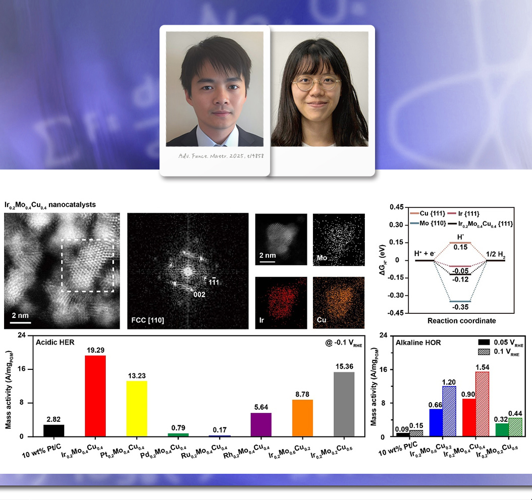 在能源轉換領域,氫的生成 (HER) 與氧化反應 (HOR) 為關鍵電化學過程,鉑族金屬 (PGM) 因其優異的催化活性與穩定性,長期被視為氫相關反應的標準催化劑。為了降低貴金屬用量並提升催化效率,本研究採用「Sabatier Principle」(即吸附-脫附能力需達最佳中間值) 為設計原則,開發出一系列低 PGM 含量的三元合金催化劑。選擇鉑族金屬(Pt、Pd、Ir、Rh 及 Ru)與具強吸氫能力的 Mo 及弱吸氫能力的 Cu 進行組合,透過特別的自催化還原機制合成出高原子利用率的三元合金觸媒。此策略經理論計算與實驗證明有效調控氫的吸附與脫附行為,使其落於 Sabatier 原則所建議的最佳吸附能範圍內,進而提升反應速率並降低能量損耗。實驗結果顯示,這類三元合金催化劑 (特別是IrMoCu) 在鹼性電解或燃料電池條件下對於 HER 與 HOR 皆展現出優異性能,不僅催化活性高、質量活化率大幅提升,且在耐久性測試中保持穩定。該設計策略同時回應了貴金屬用量降低與高效催化的雙重挑戰。此外,本研究也從組成-性能關係出發,探討三元合金中不同金屬成分對催化活性與穩定性的影響,提供了合金催化劑從成分選擇、配位環境到催化性能實現的系統化設計。本研究於多元合金觸媒的設計與元素協同調控上提出創新策略,為氫能源電化學轉換系統的高效催化劑開發提供新方向。